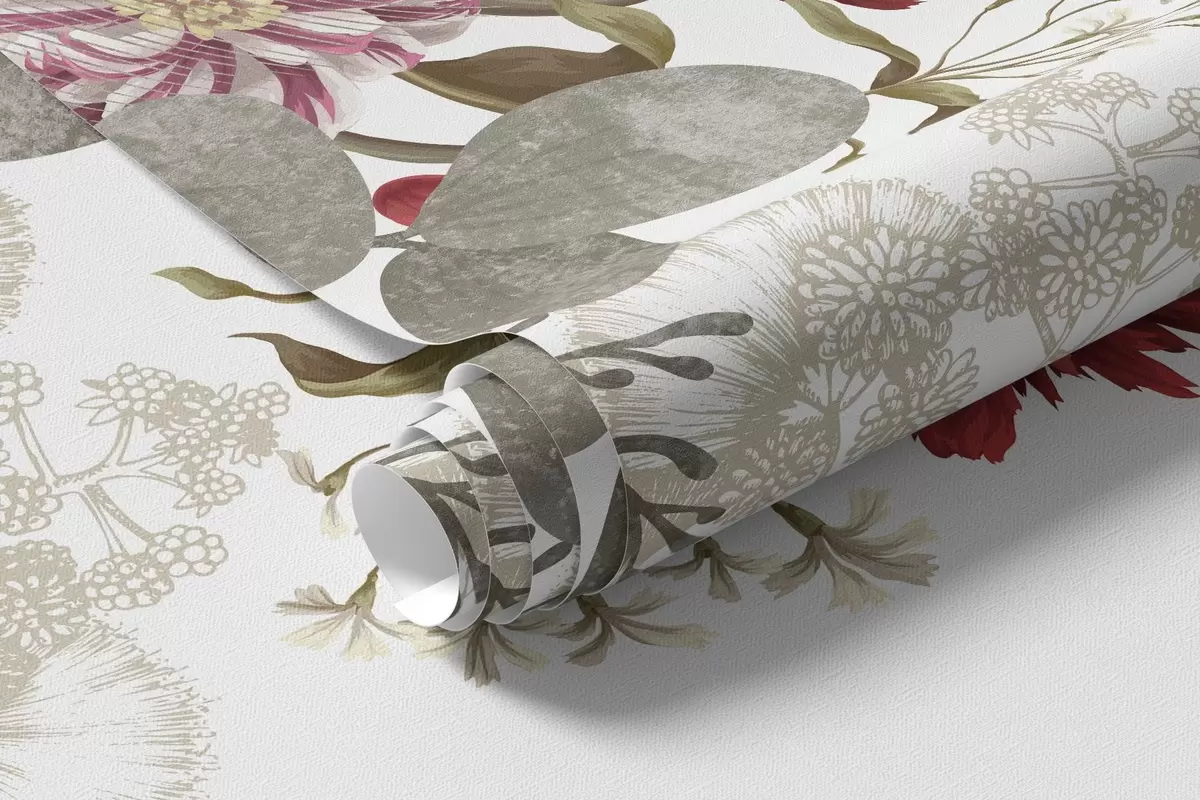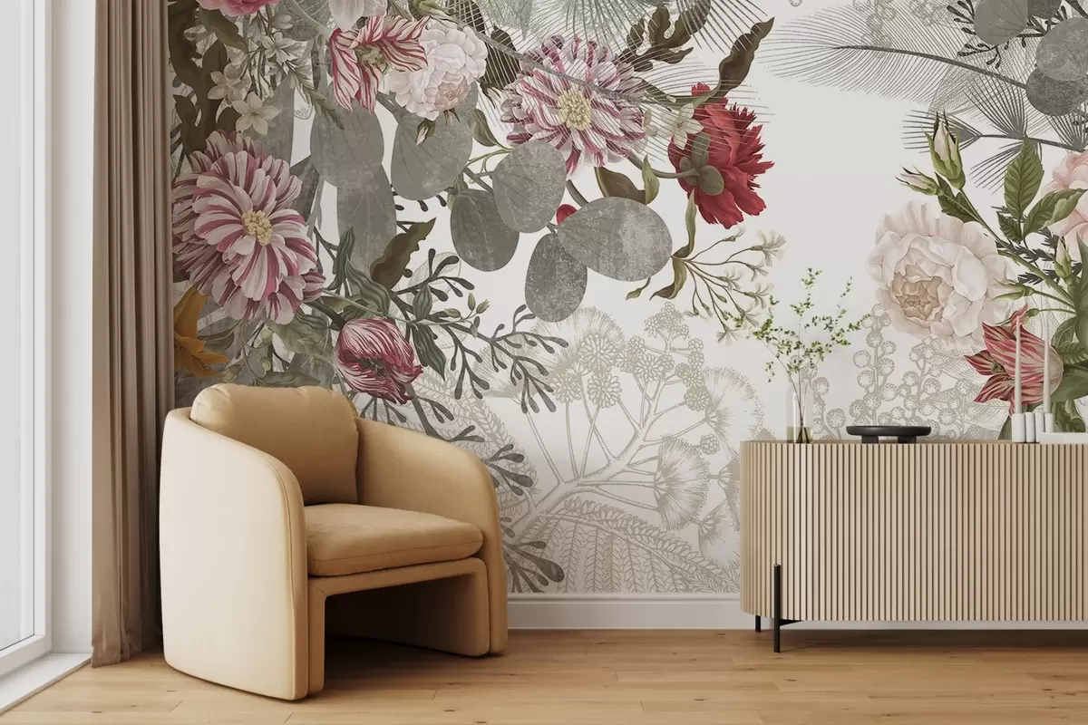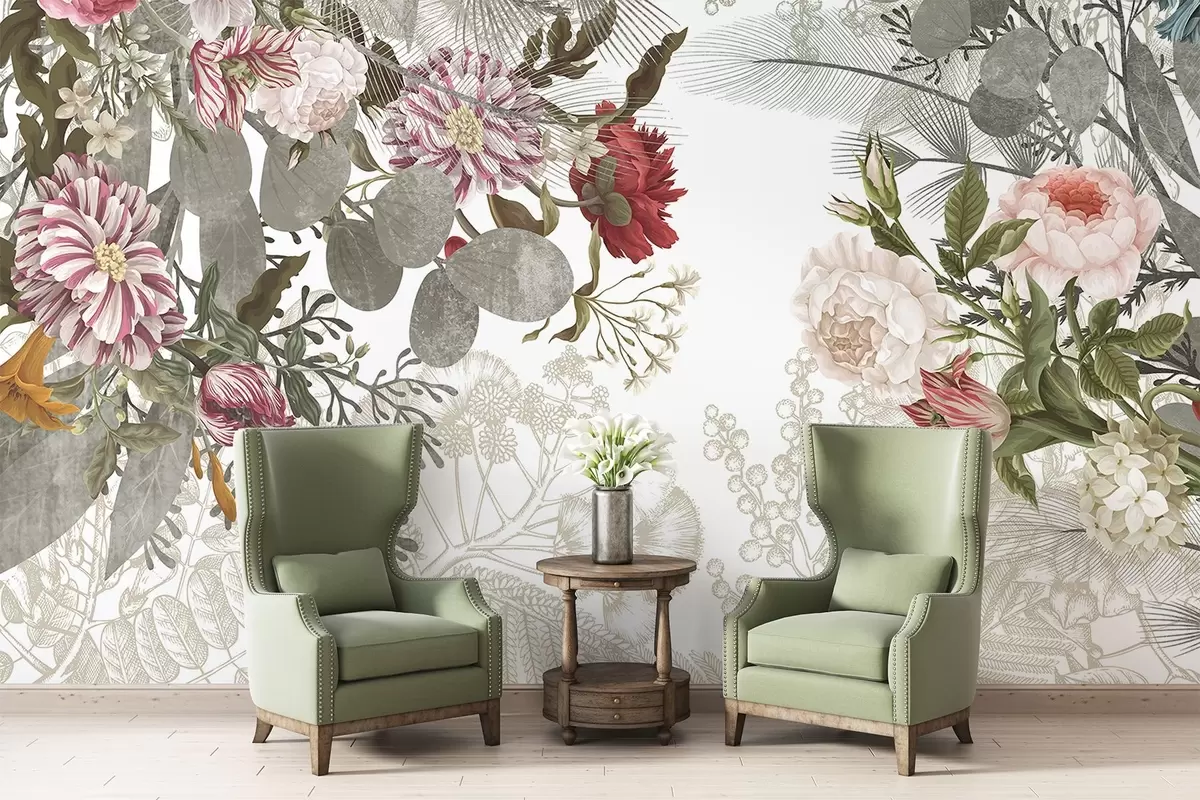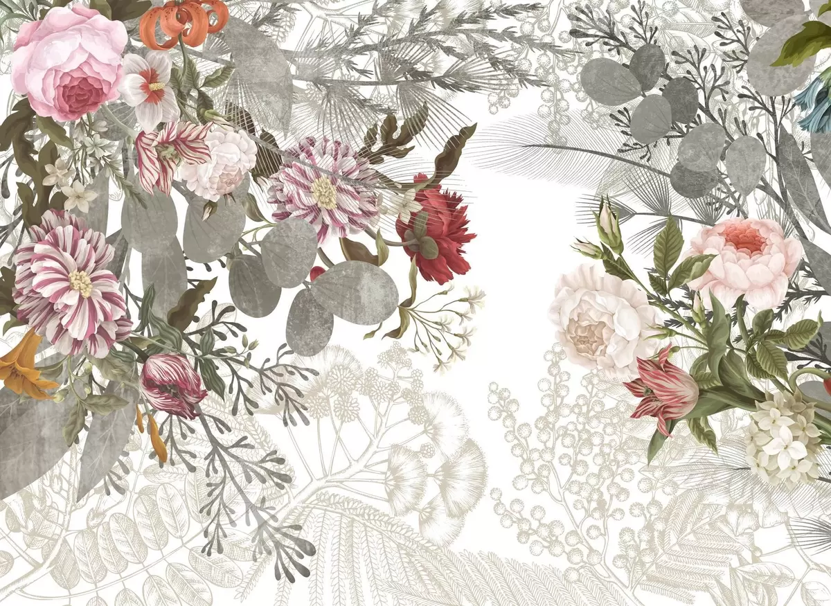 Vintage floral arrangement with roses, eucalyptus, and mimosa in shades of muted green, red and pink - Wall mural (No. w09164v1)