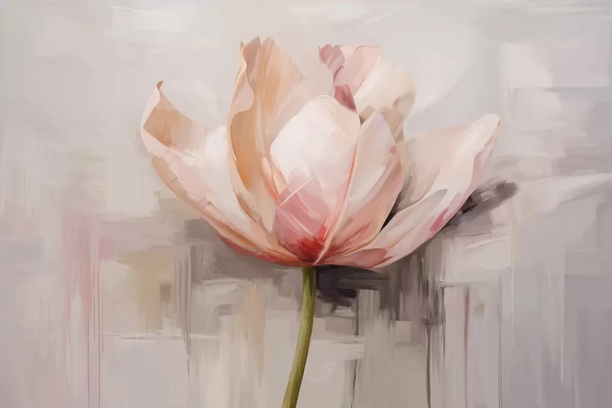 Pink tulip, oil painting imitation with soft brush strokes, abstract background with pastel shades of gray and beige - Wall mural (No. w09187)