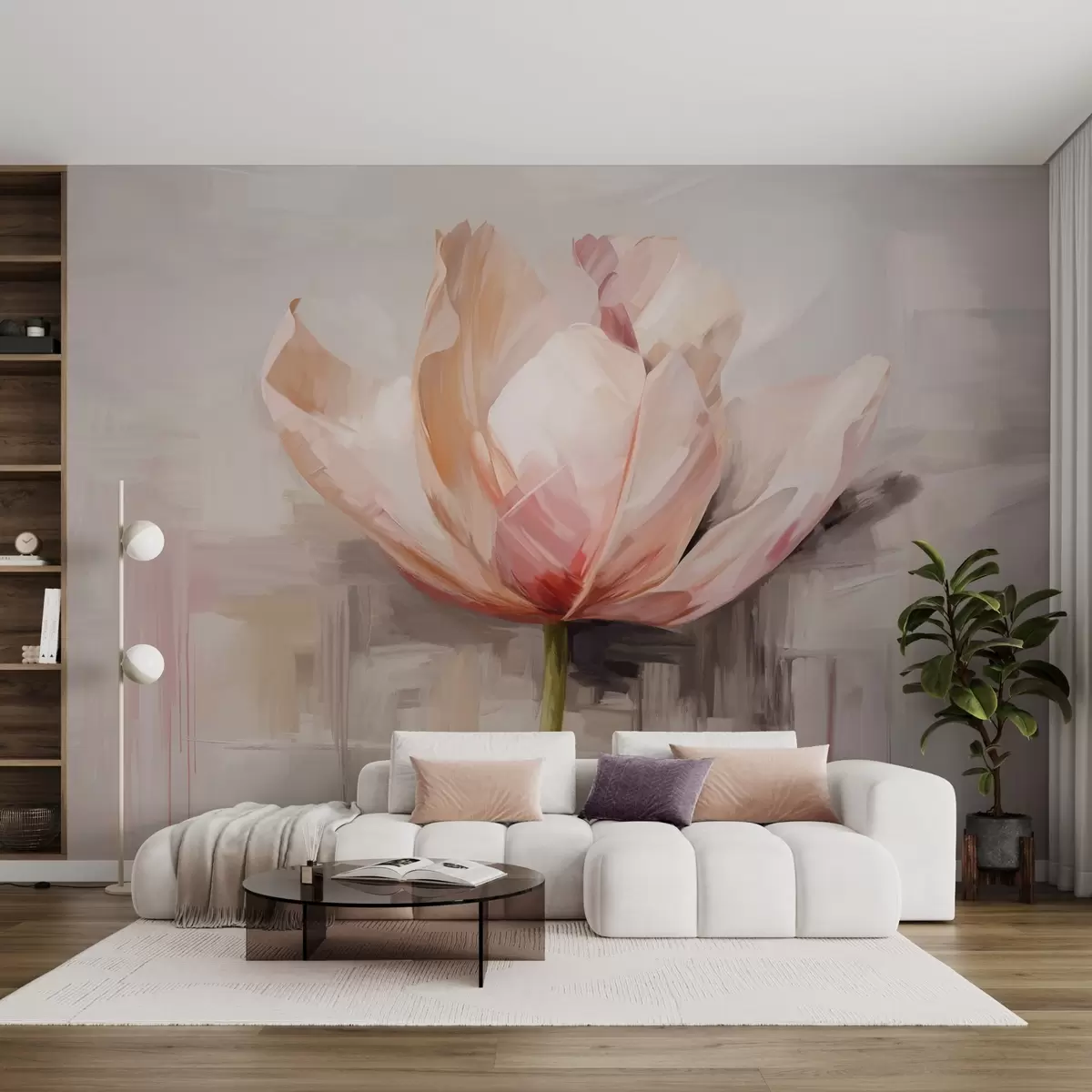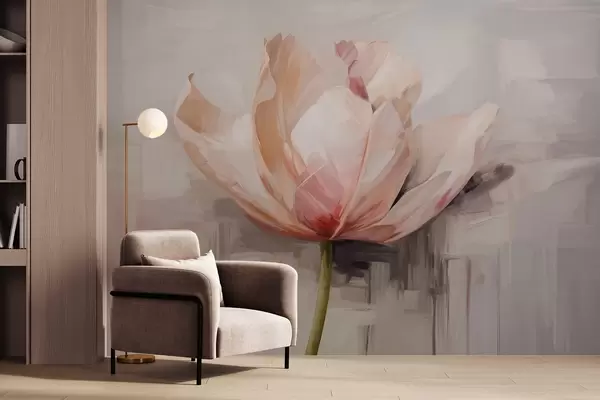 Pink tulip, oil painting imitation with soft brush strokes, abstract background with pastel shades of gray and beige - Wall mural (No. w09187)