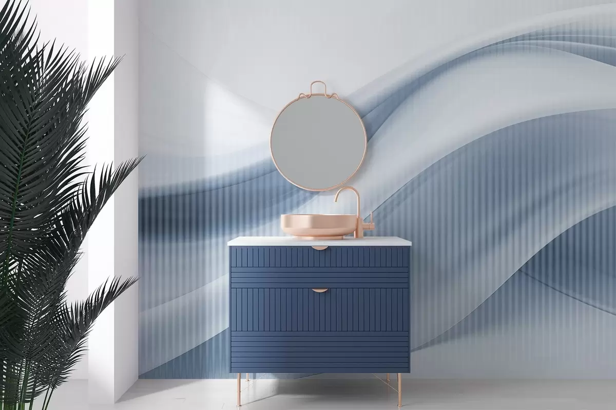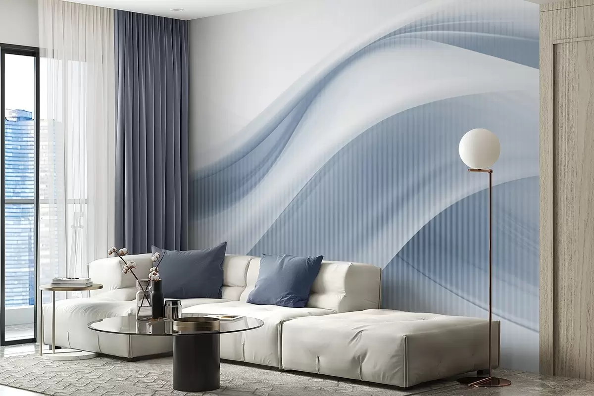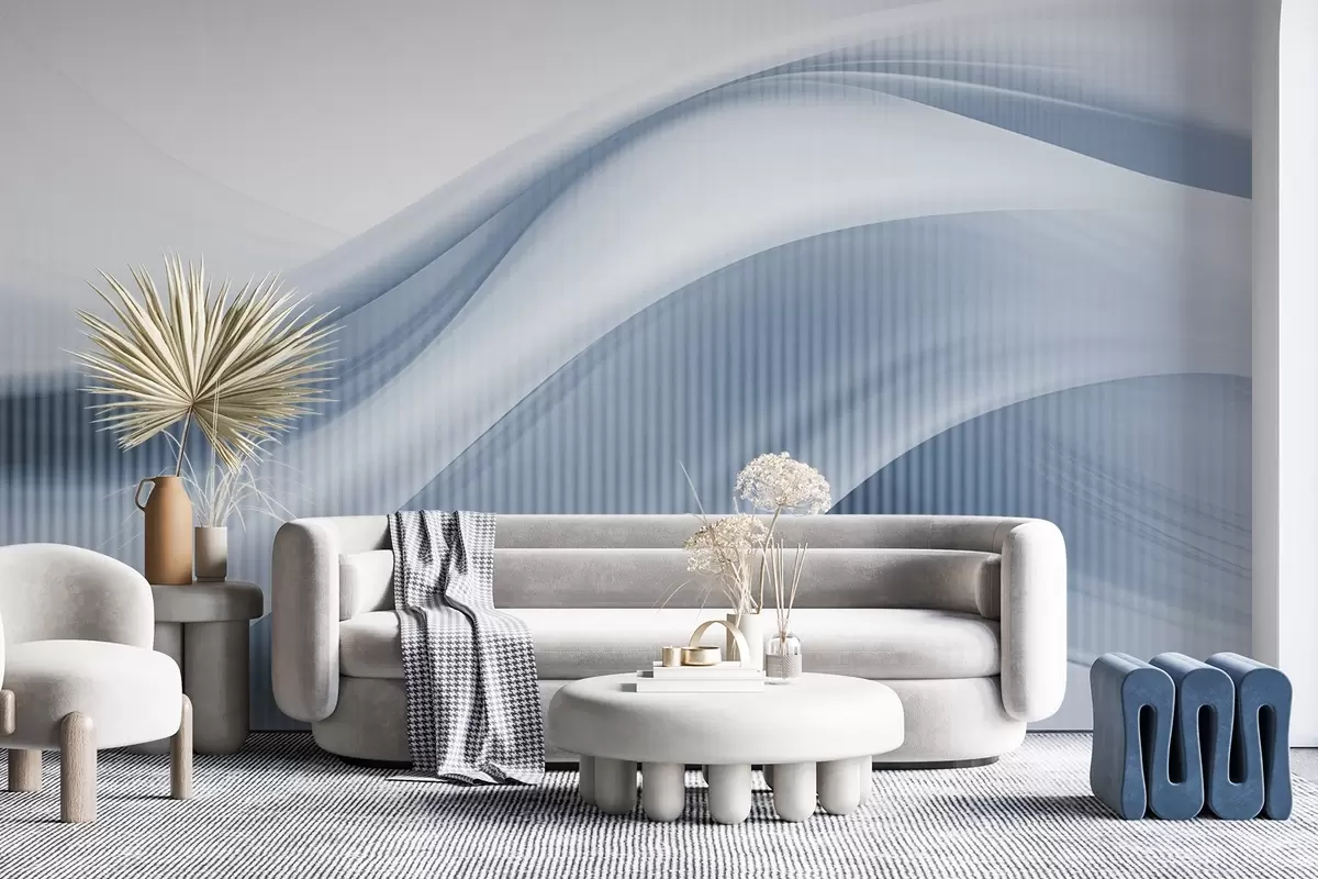Abstract print with flowing lines and subtle vertical stripes, creating a sense of movement and depth, blue palette - Wall mural (No. w09189v1)