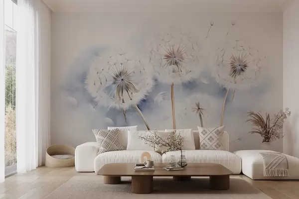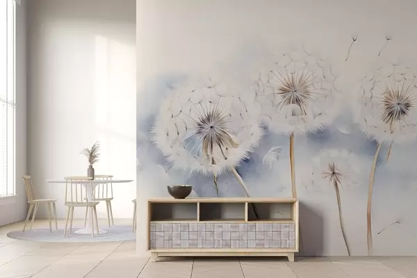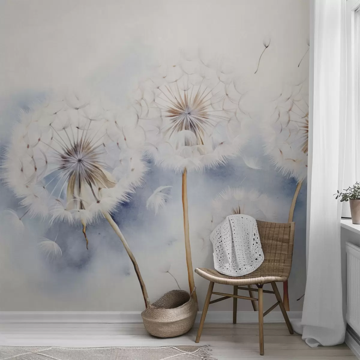 Textured dandelions with seeds floating in the air, light blue and white background, soft delicate drawing style - Wall mural (No. w09190)