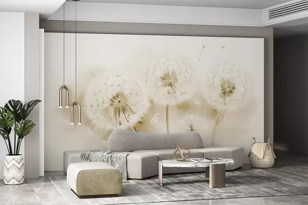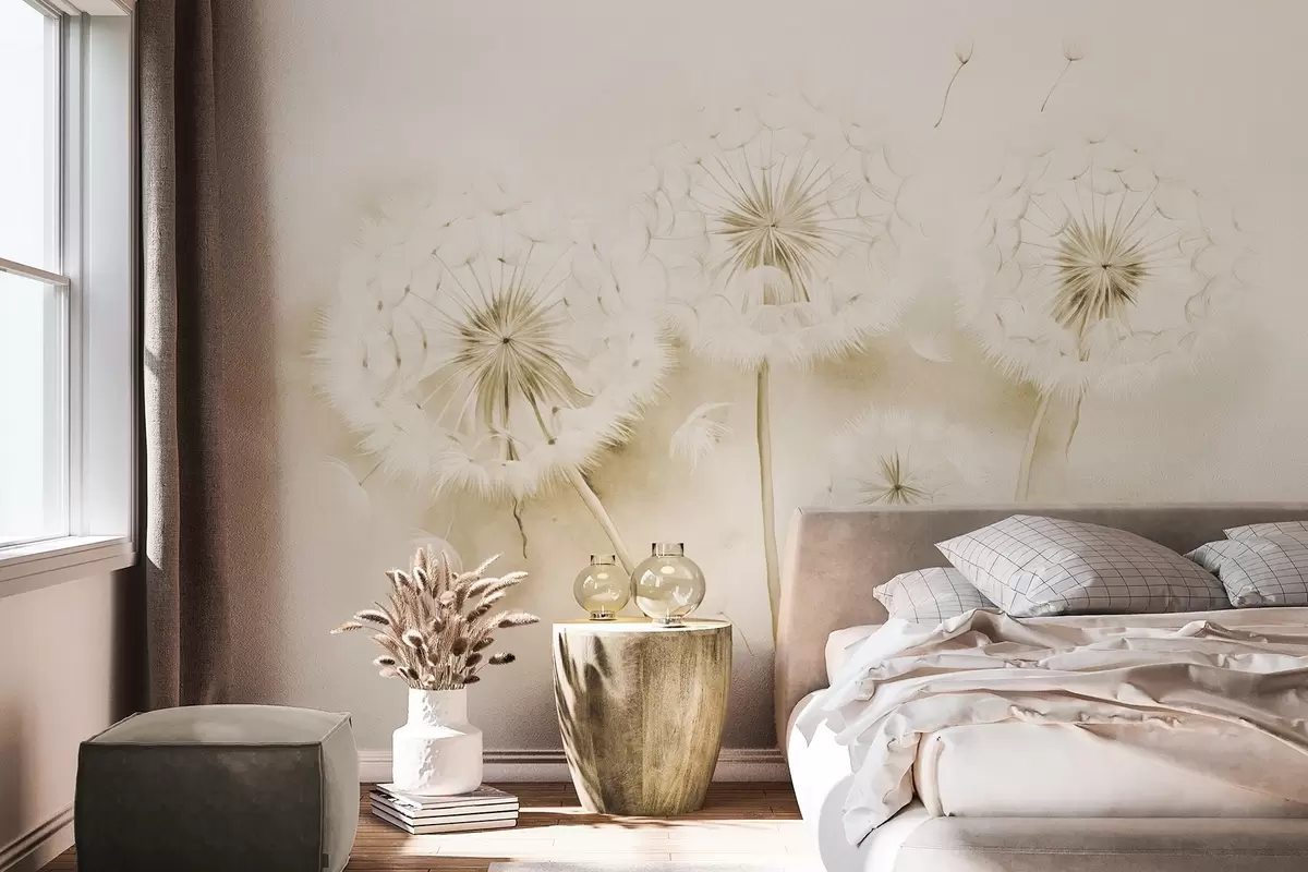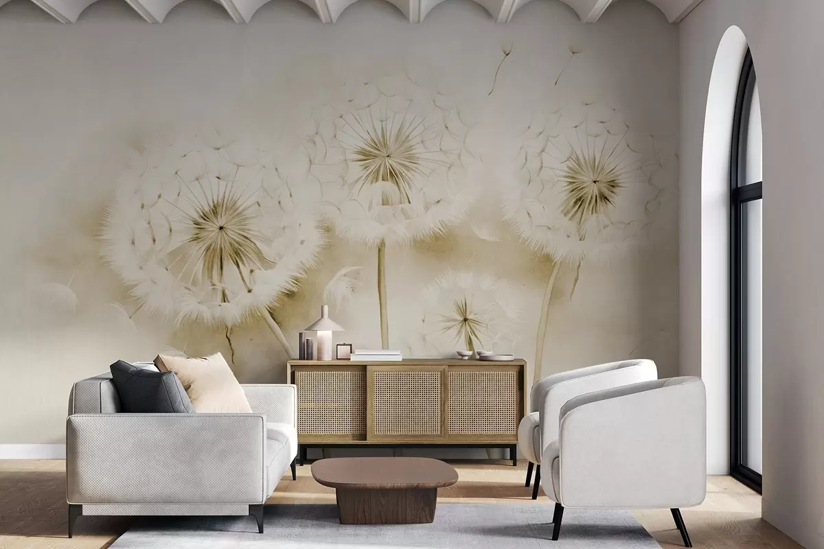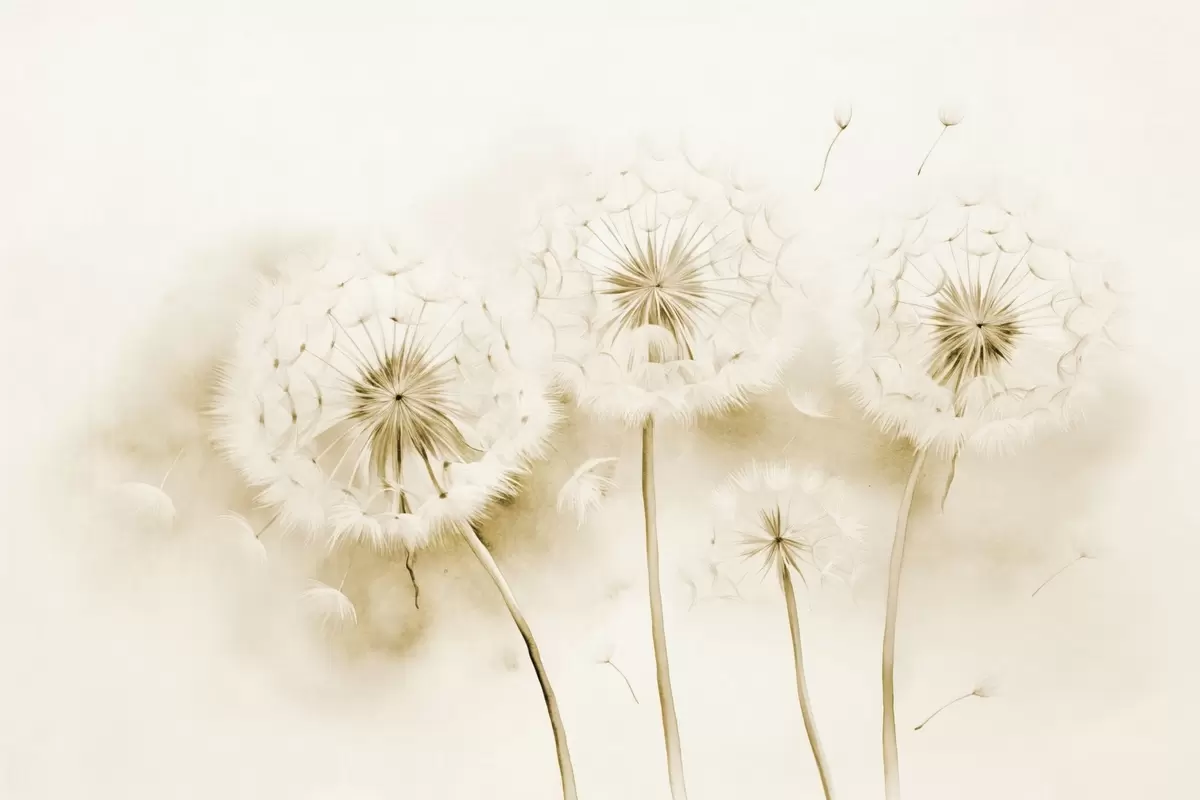 Textured dandelions with seeds floating in the air, muted yellow and white background, soft delicate drawing style - Wall mural (No. w09190v1)