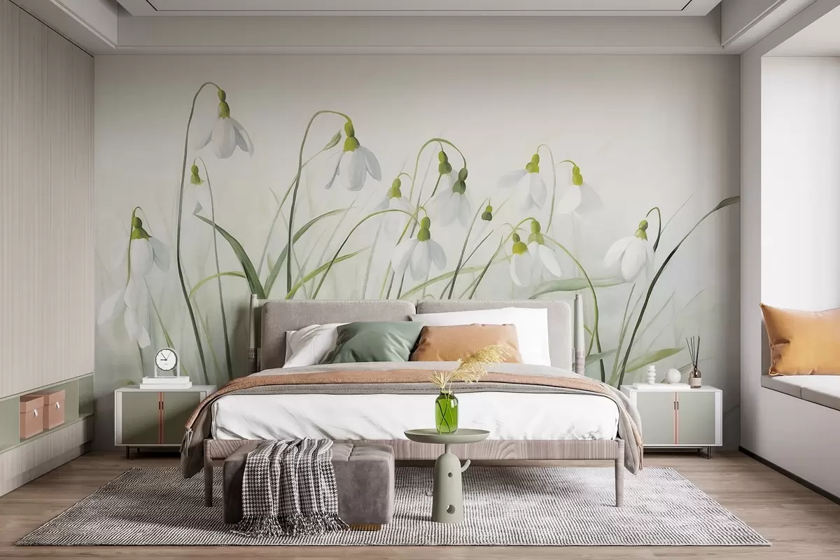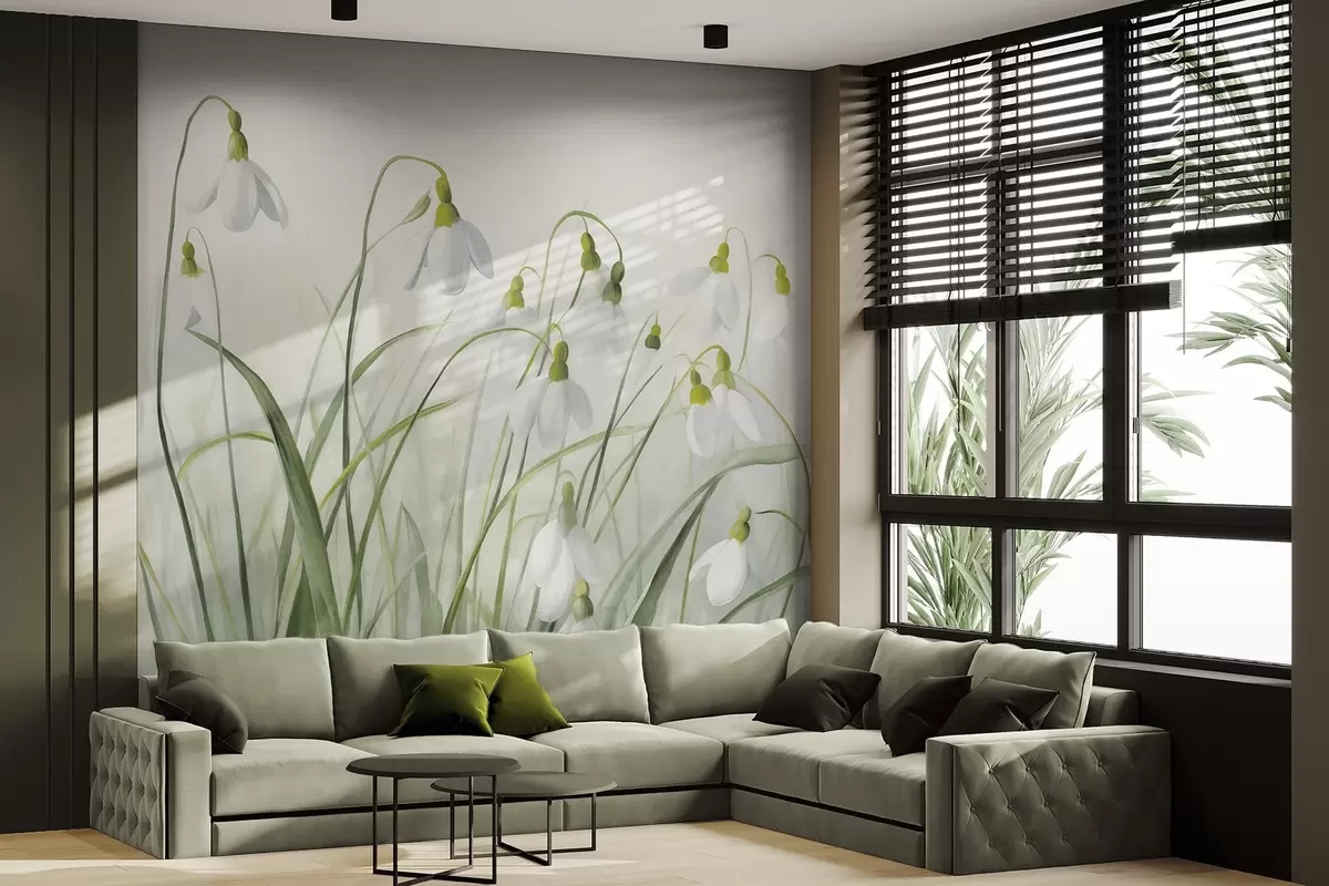 Snowdrop flowers with green textured stems and leaves, watercolor spring style, delicate brushstrokes - Wall mural (No. w09195)