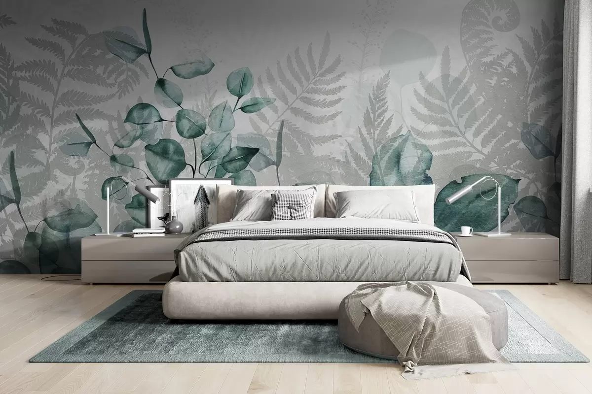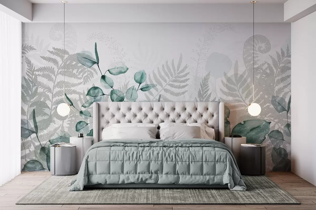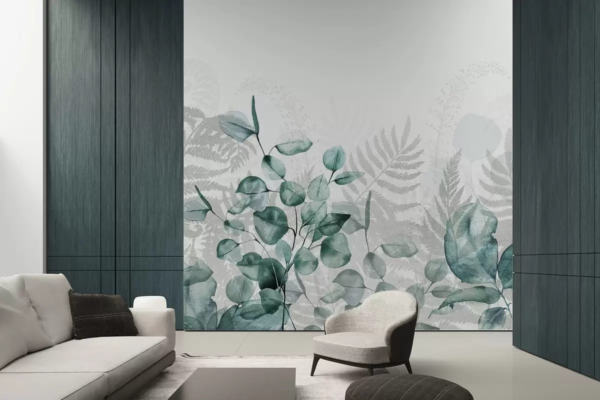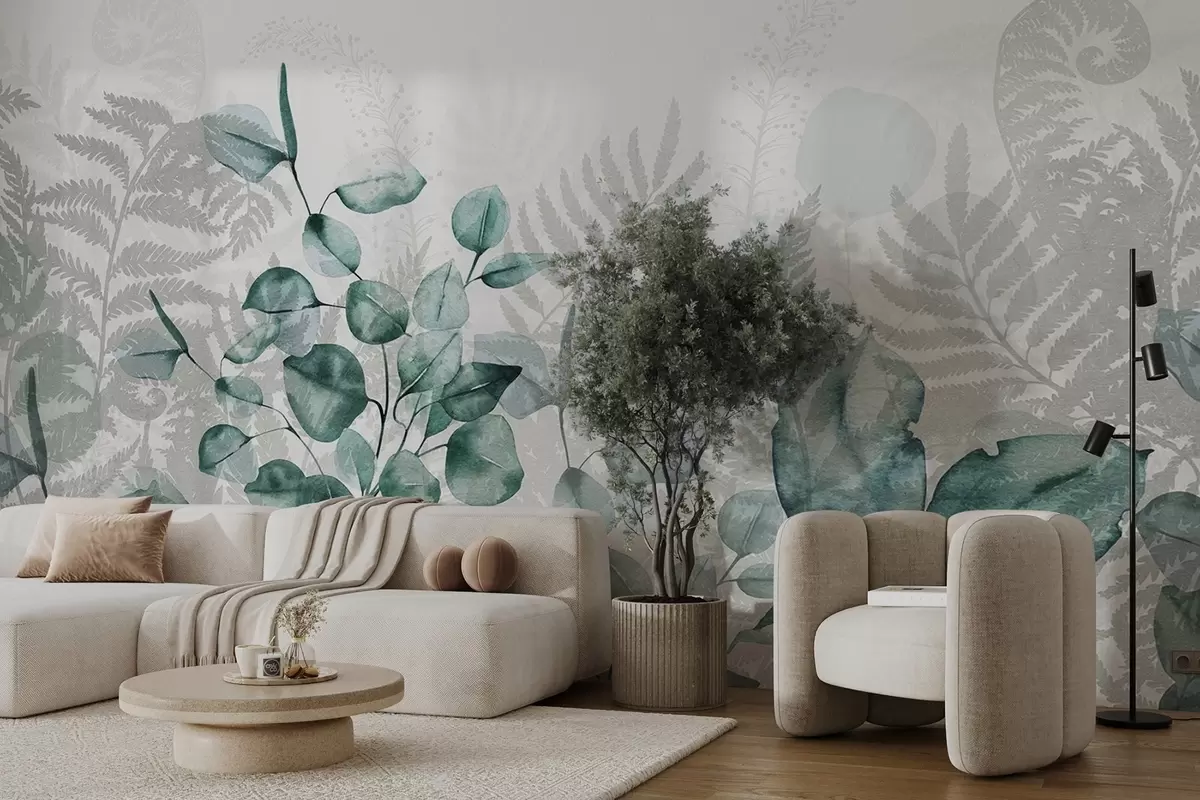 Eucalyptus and fern leaves in shades of green and gray, watercolor effect , botanical illustration - Wall mural (No. w09197)
