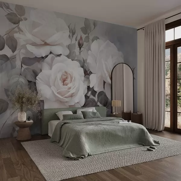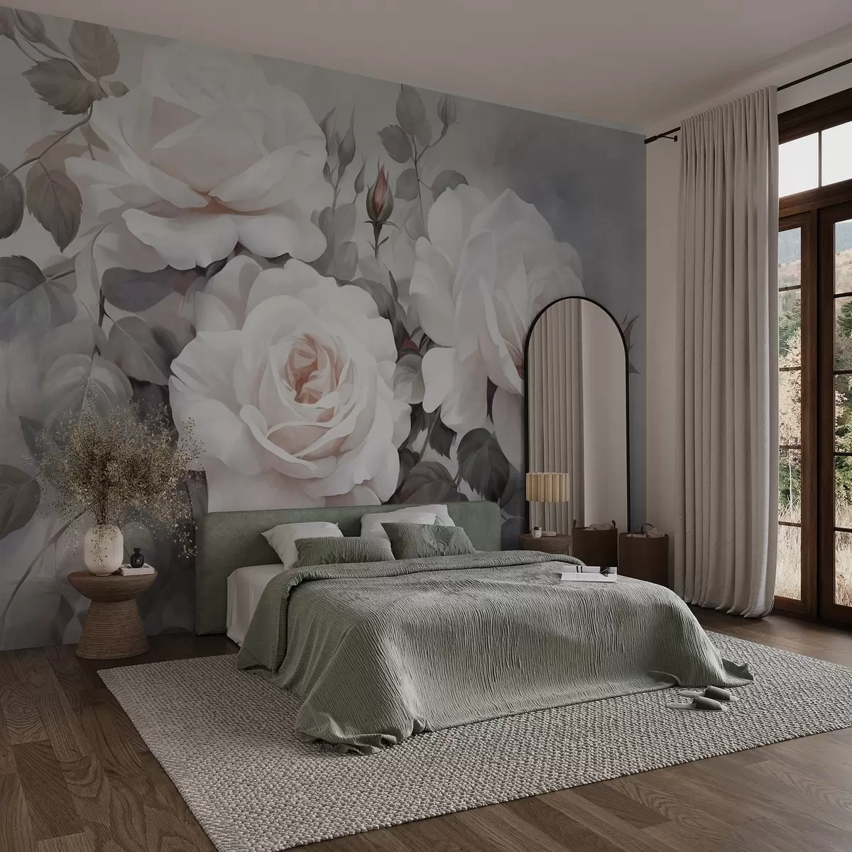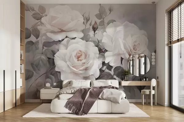 wall murals Textured white roses with leaves and stems, soft muted pastel colors, elegant vintage style , delicate brushstrokes w09198