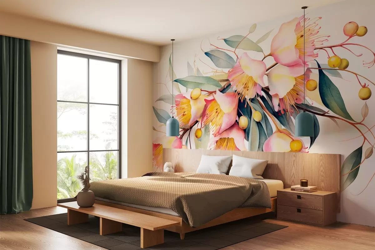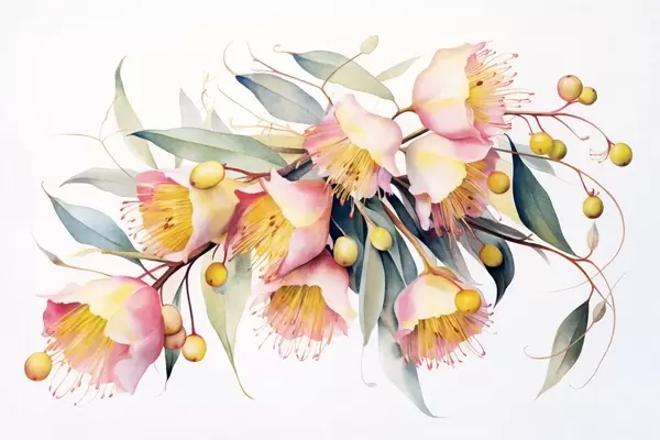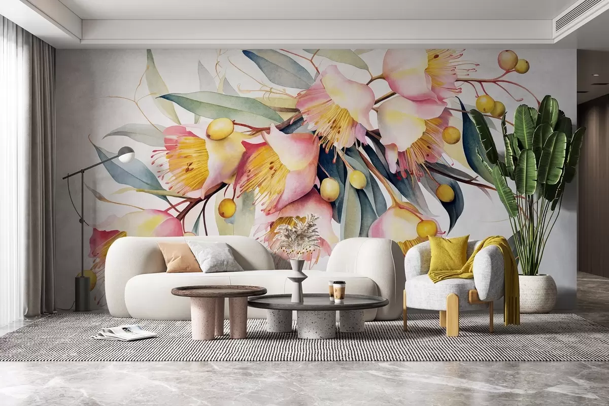 Eucalyptus flowers with green leaves, watercolor style, soft and textured, light background, botanical floral design - Wall mural (No. w09202)