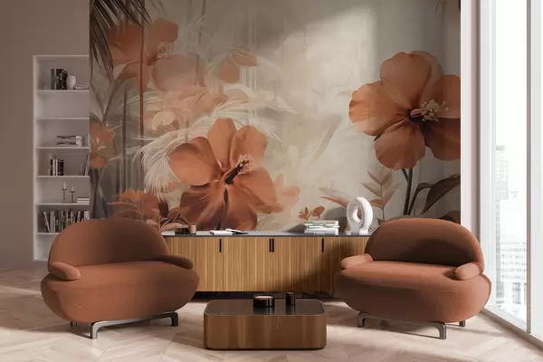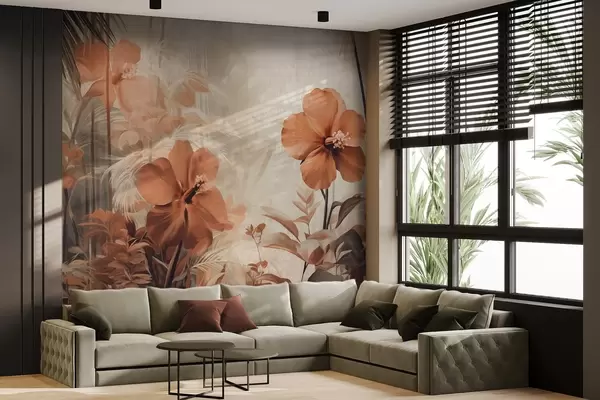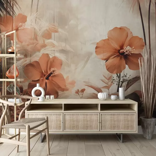 Pastel red hibiscus flowers with leaves and stems, tropical vegetation, soft, muted colors, vintage style - Wall mural (No. w09203)