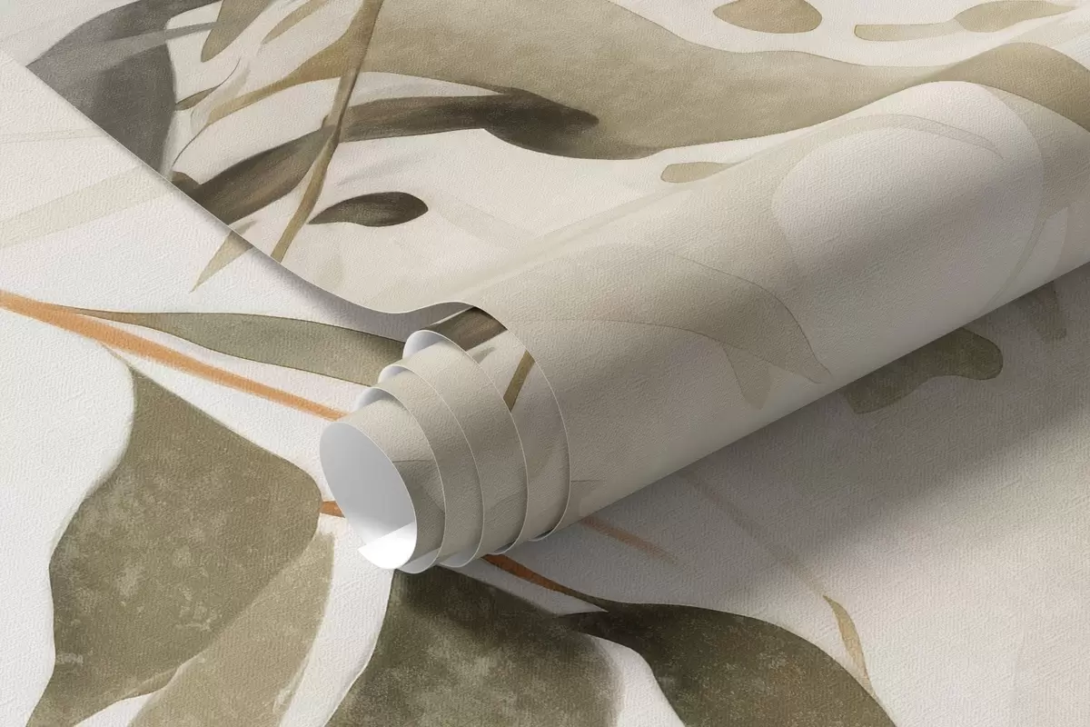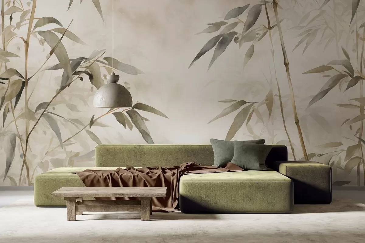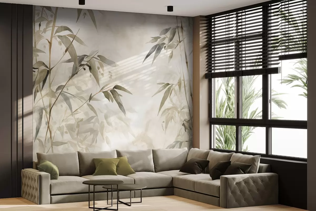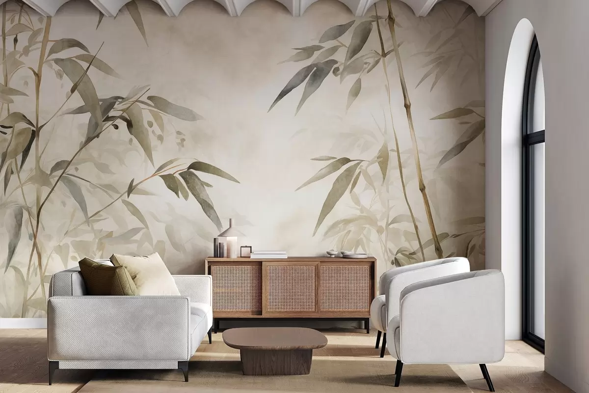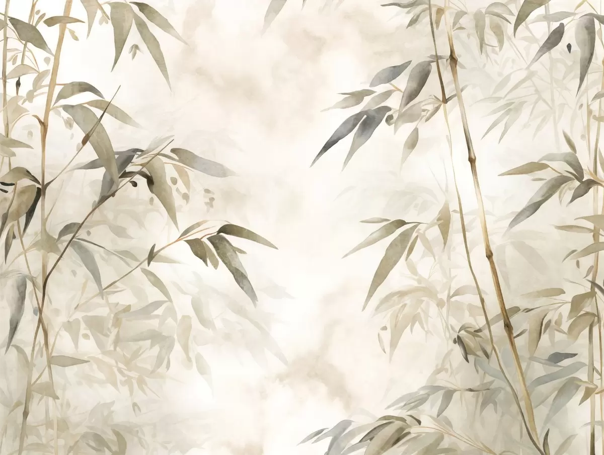 Bamboo textured branches with leaves in a watercolor style, soft neutral color palette, light beige background - Wall mural (No. w09204)