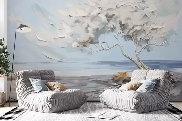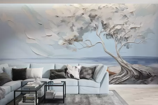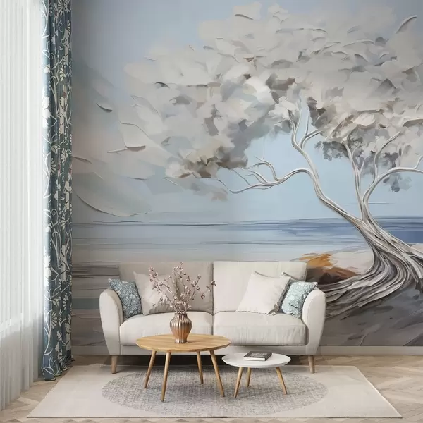 A white tree with thick and textured leaves on a sandy beach, landscape with a light blue sky - Wall mural (No. w09205)
