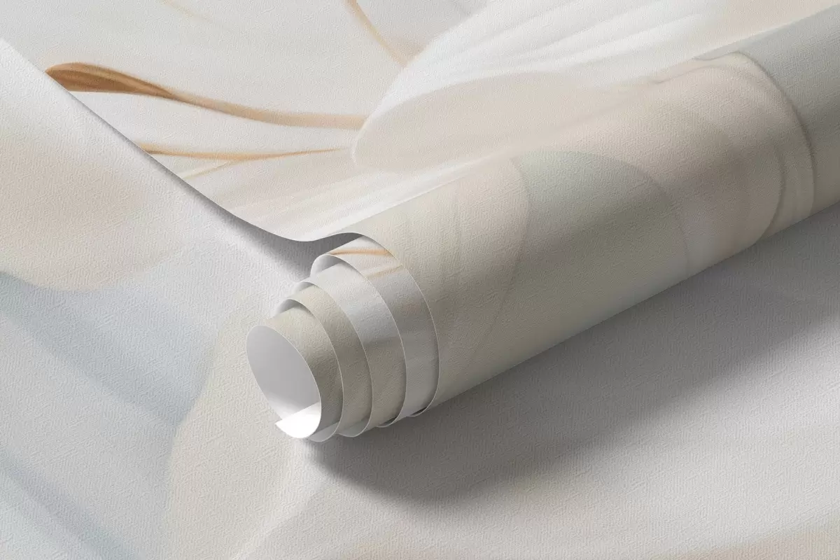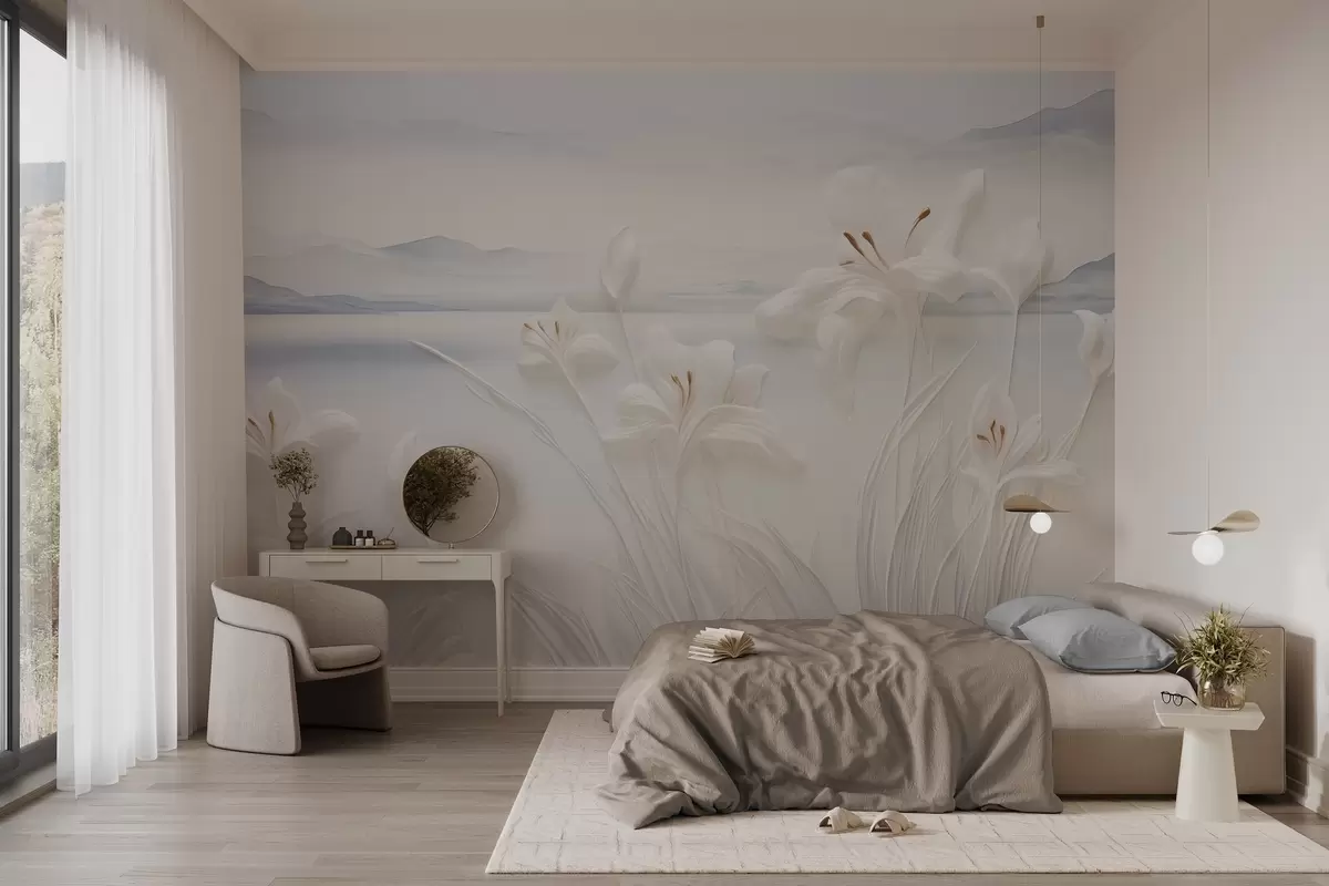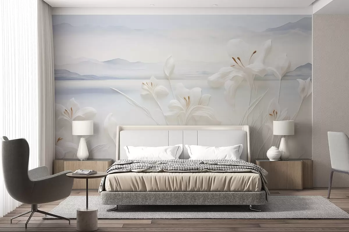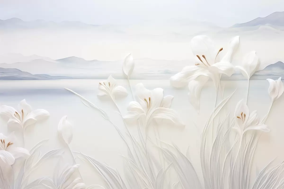 White lilies with long stems and leaves, mountains and lake in the background, minimalist landscape composition - Wall mural (No. w09206)