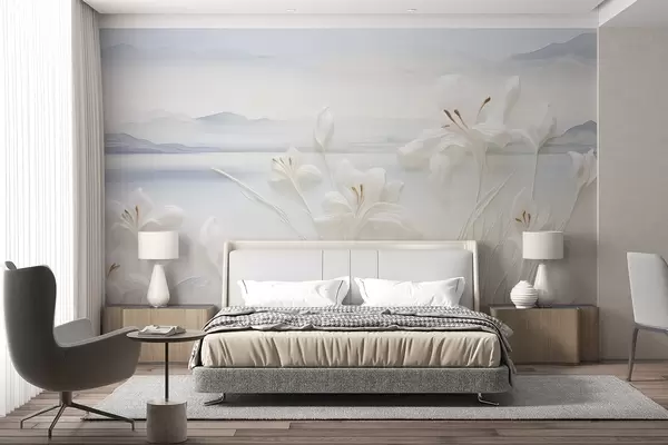 White lilies with long stems and leaves, mountains and lake in the background, minimalist landscape composition - Wall mural (No. w09206)