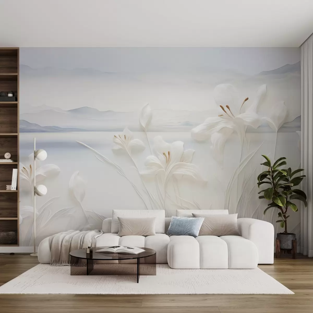 wall murals White lilies with long stems and leaves, mountains and lake in the background, minimalist landscape composition w09206