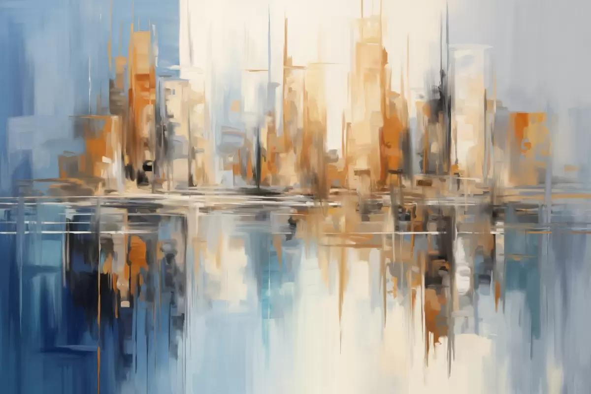 Abstract textured cityscape with tall buildings in shades of orange, blue and white, reflected in water - Wall mural (No. w09207)