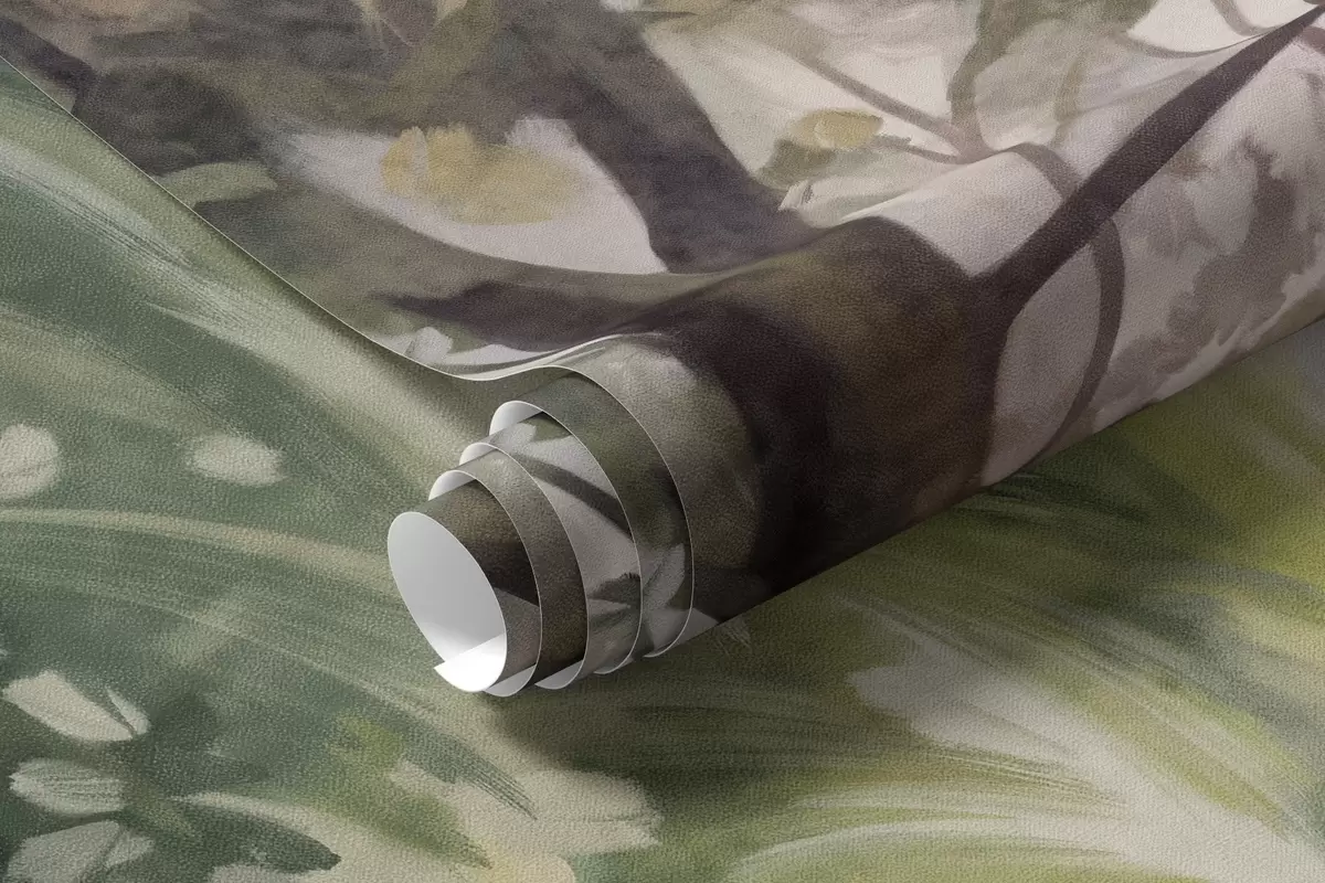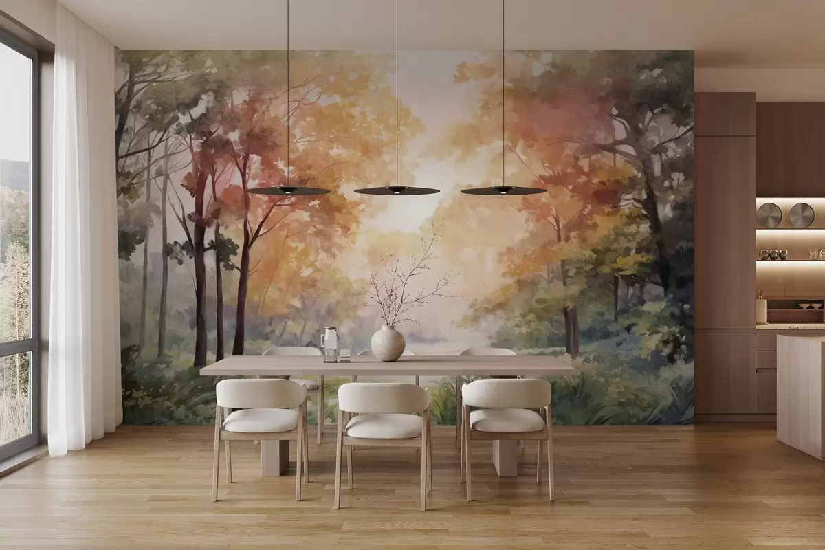Textured forest landscape, trees with orange and green leaves, pastel color palette - Wall mural (No. w09210v1)