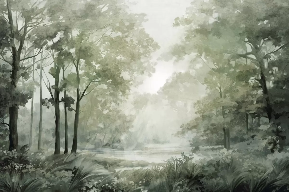 Textured forest landscape, trees with green leaves, pastel color palette - Wall mural (No. w09210v2)