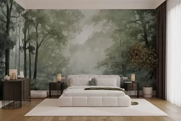 wall murals Textured forest landscape, trees with  green leaves, pastel color palette w09210v2
