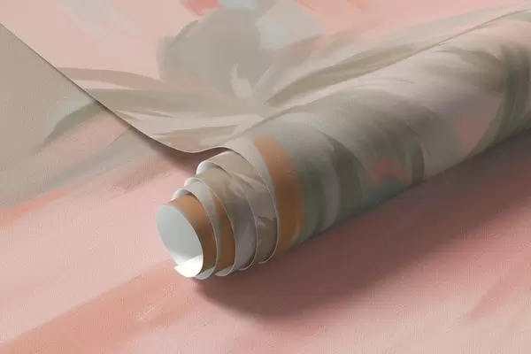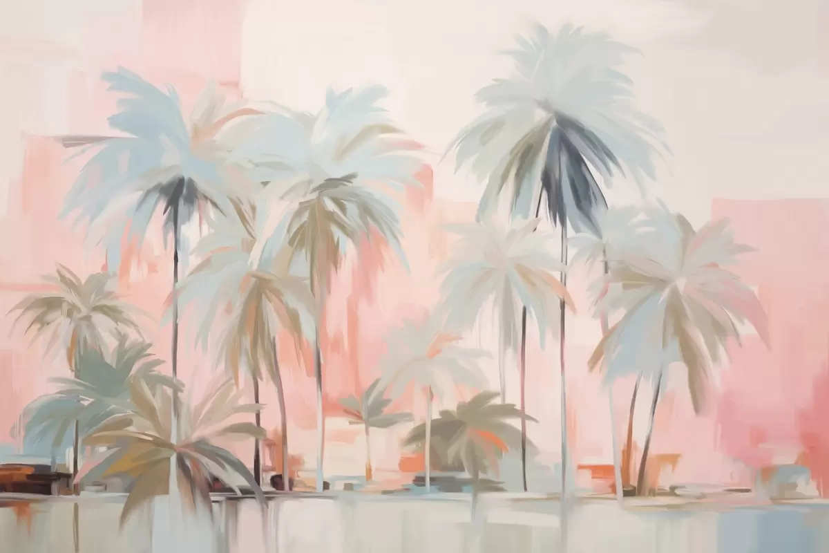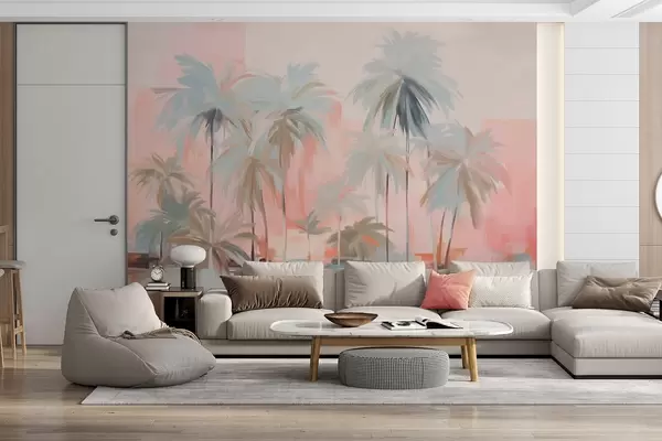 Abstract minimalistic pastel tropical palm trees, against a background of soft pink and peach hues - Wall mural (No. w09212)