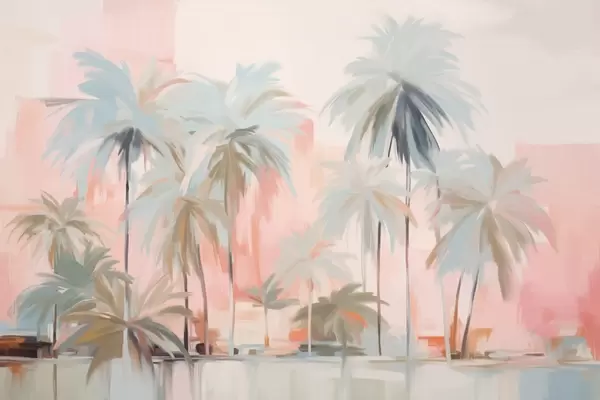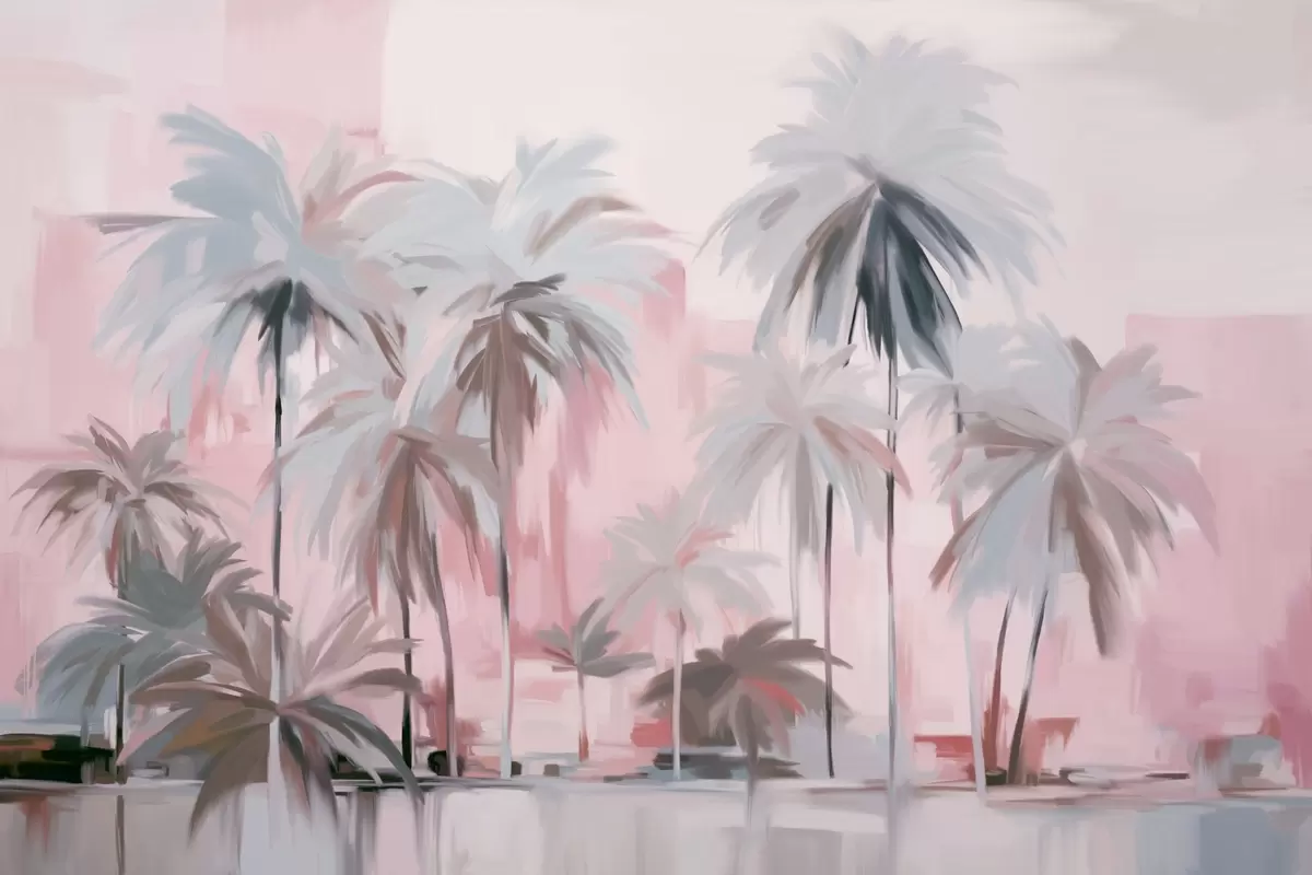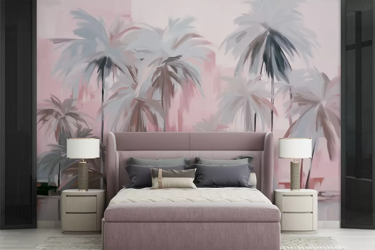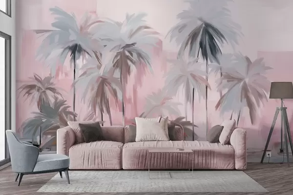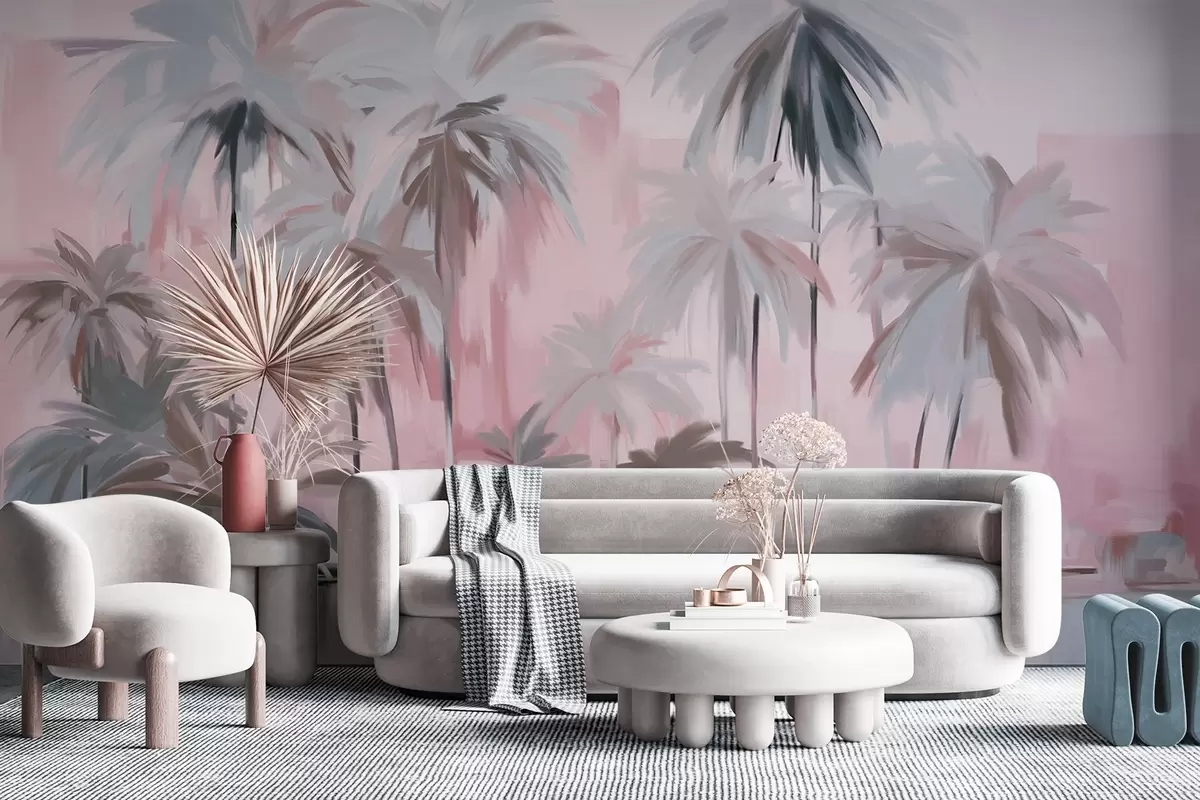 Abstract minimalistic pastel tropical palm trees, against a background of muted pink and gray hues - Wall mural (No. w09212v1)