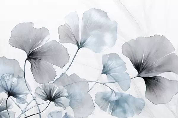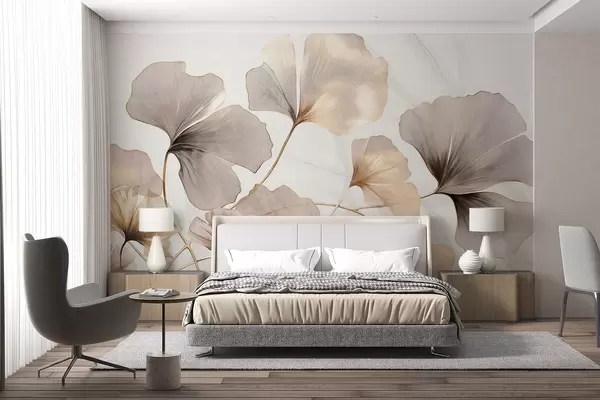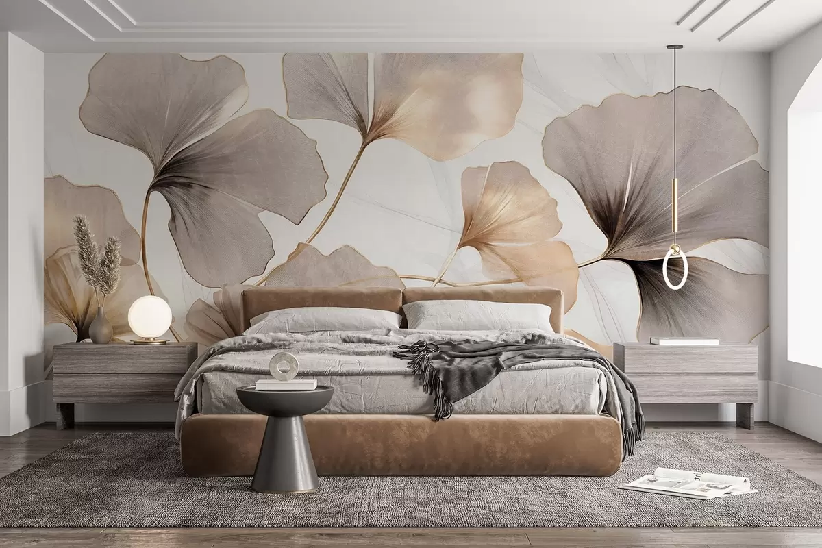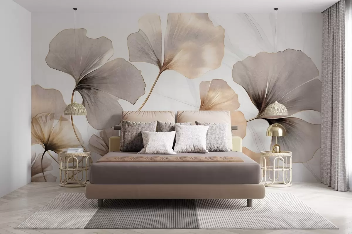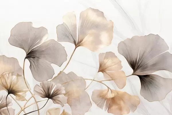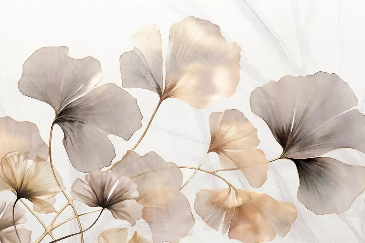 Ginkgo biloba leaves in beige, yellow and brown tones, delicate textured watercolor effect, light background - Wall mural (No. w09215)