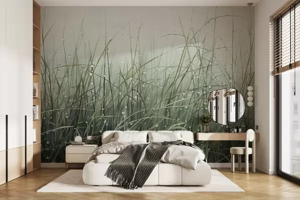 wall murals Grass with water drops, muted green shades, soft light, misty background, abstract minimalist textured style w09217