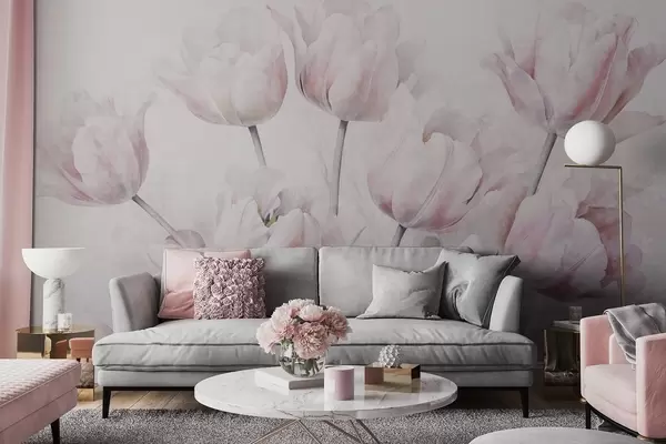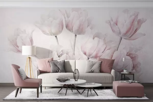 Pink textured tulips with green leaves, soft light, vintage watercolor style, delicate brushstrokes - Wall mural (No. w09220)