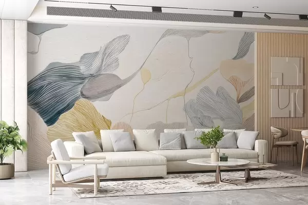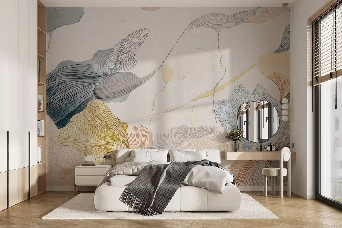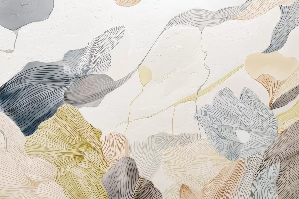 Abstract graphic leaves in warm and cool pastel tones - Wall mural (No. w09222v1)