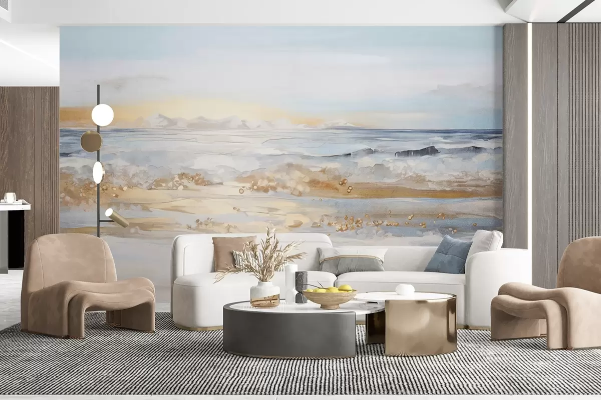 Abstract textured landscape ocean waves crashing on a sandy beach, soft pastel colors, blue sky with light clouds - Wall mural (No. w09234)