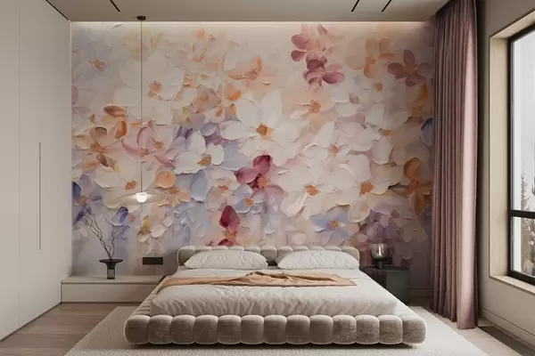 Oil painting imitation of a flower garden with white, pink and orange flowers, soft brushstrokes, pastel muted colors - Wall mural (No. w09236)