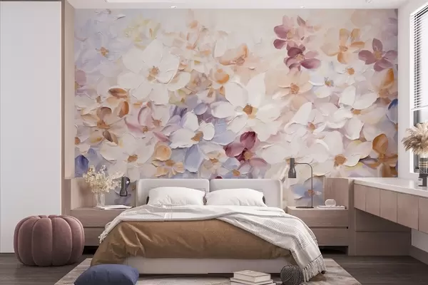 Oil painting imitation of a flower garden with white, pink and orange flowers, soft brushstrokes, pastel muted colors - Wall mural (No. w09236)