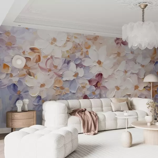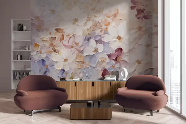 Oil painting imitation of a flower garden with white, pink and orange flowers, soft brushstrokes, pastel muted colors - Wall mural (No. w09236)