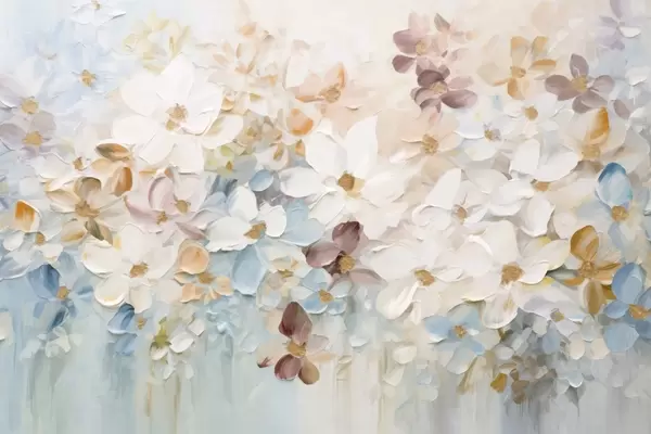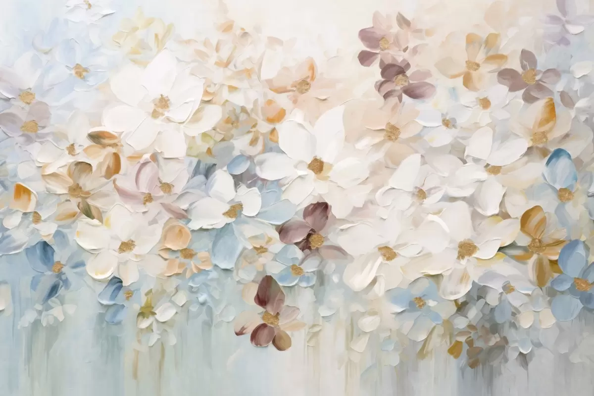Oil painting imitation of a flower garden with white, blue and orange flowers, soft brushstrokes, pastel muted colors - Wall mural (No. w09236v1)