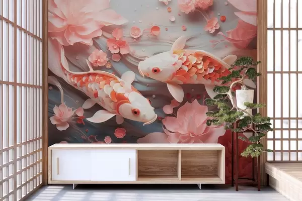 Delicate fish with dimensional scales swim through a flow of petals and soft pink tones - Wall mural (No. w09237)