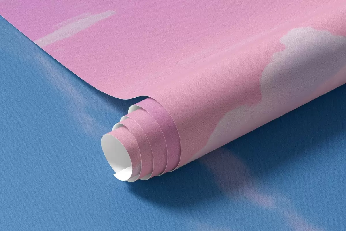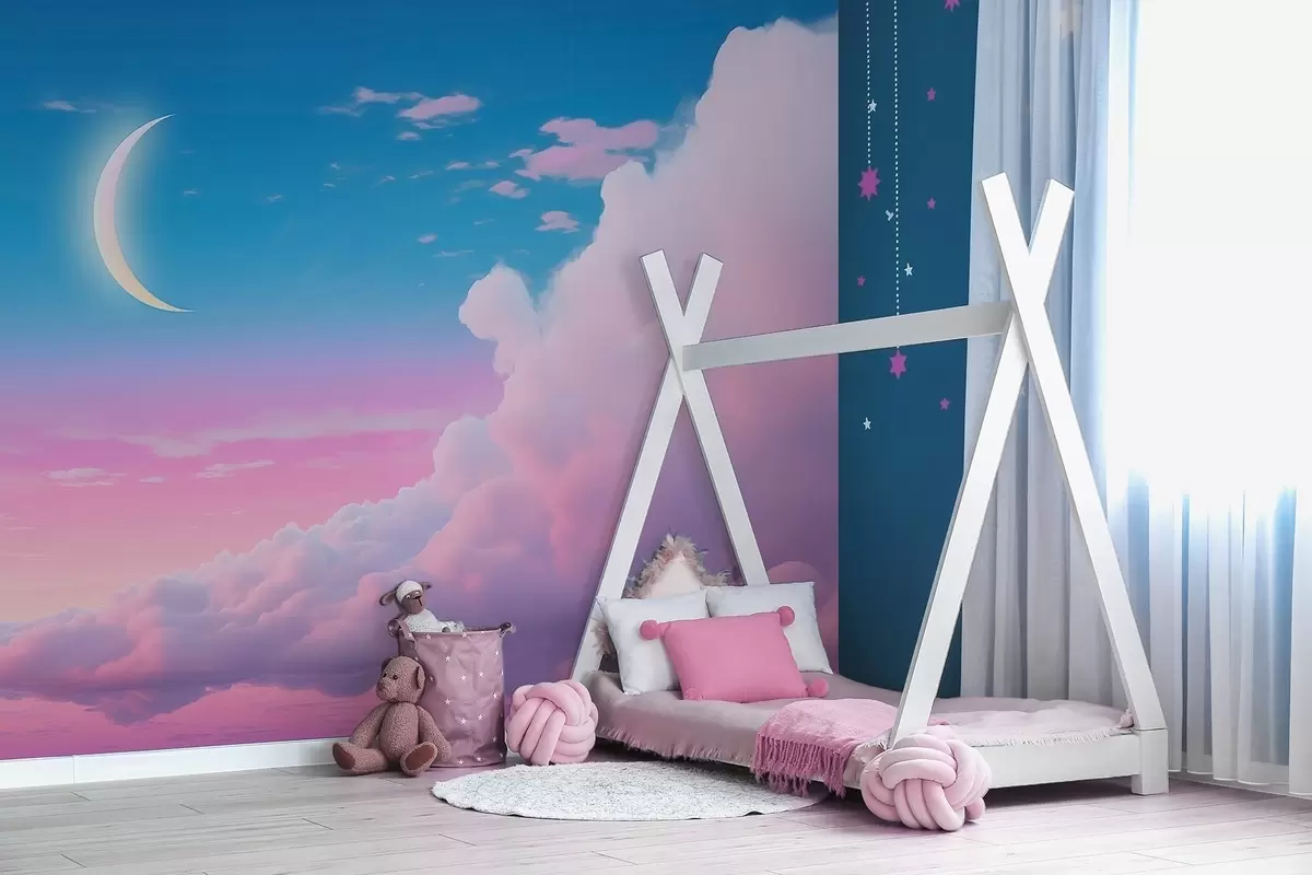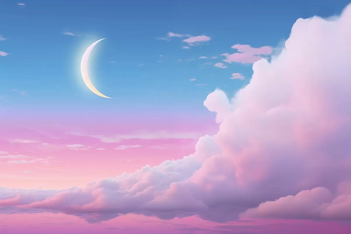 Magical sunset with clouds and crescent moon in pink and blue tones - Wall mural (No. w09240)