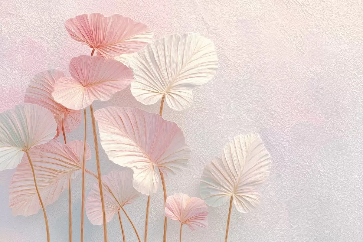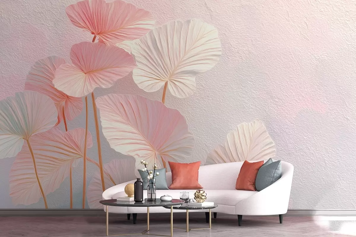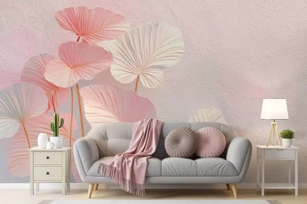 Elegant large tropical leaves in soft pink and blue hues - Wall mural (No. w09252)