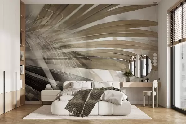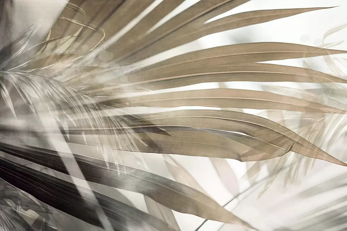 Palm leaves with a light brown hue, overlapping and creating a layered effect, against a soft, neutral background - Wall mural (No. w09256)