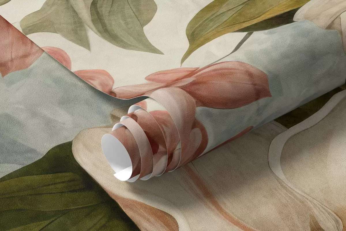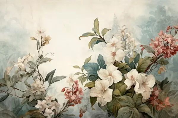 Textured tropical flowers and leaves with soft blue and green hues, delicate brushstrokes, vintage botanical style - Wall mural (No. w09259)