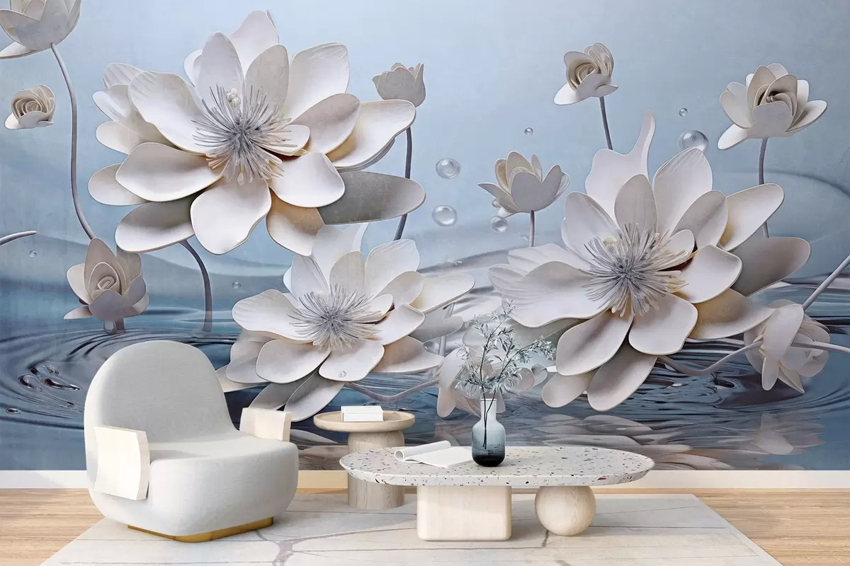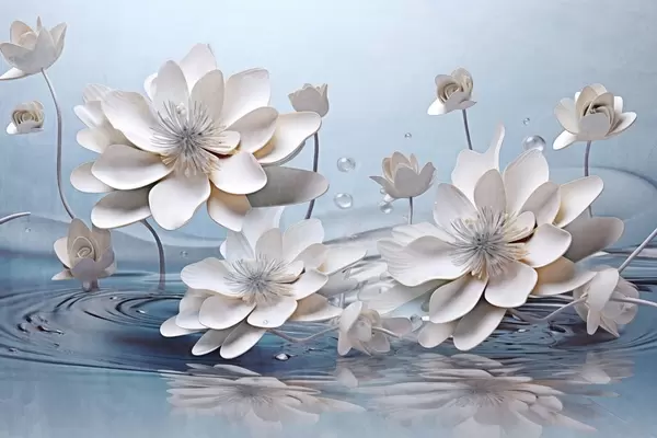 White textured flowers with water drops, reflections on the water surface, light blue background, elegant design - Wall mural (No. w09262)