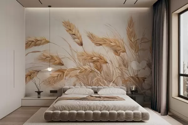 Wheat textured field with beige ears of grain swaying in the wind, soft and muted colors, creating a sense of warmth - Wall mural (No. w09264)