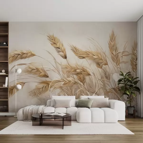 Wheat textured field with beige ears of grain swaying in the wind, soft and muted colors, creating a sense of warmth - Wall mural (No. w09264)