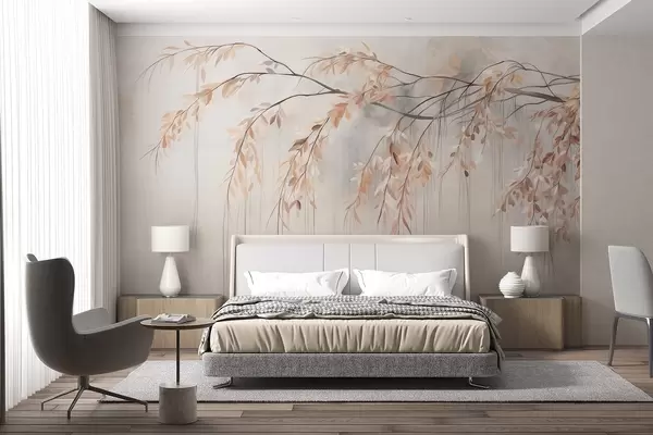A branch with light orange leaves hanging down, light gray textured blurred background, soft and delicate style - Wall mural (No. w09265)