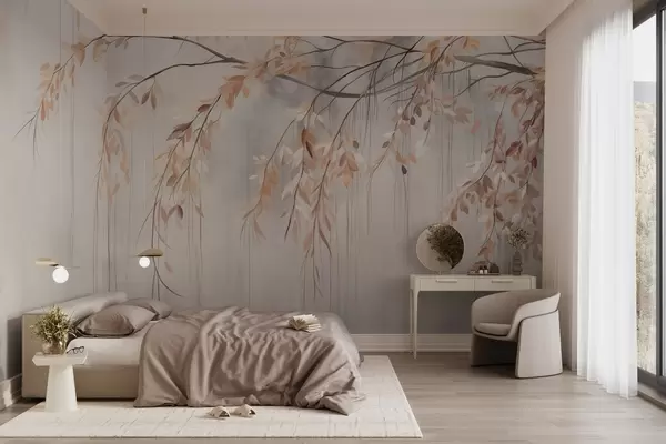 wall murals A branch with light orange leaves hanging down, light gray textured blurred background, soft and delicate style w09265