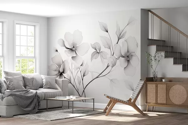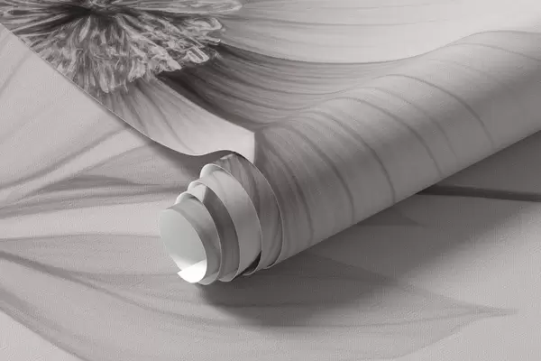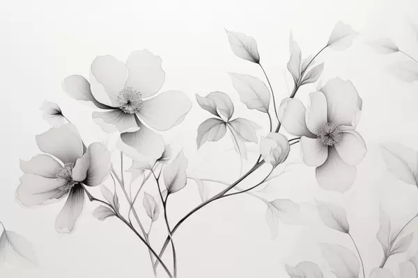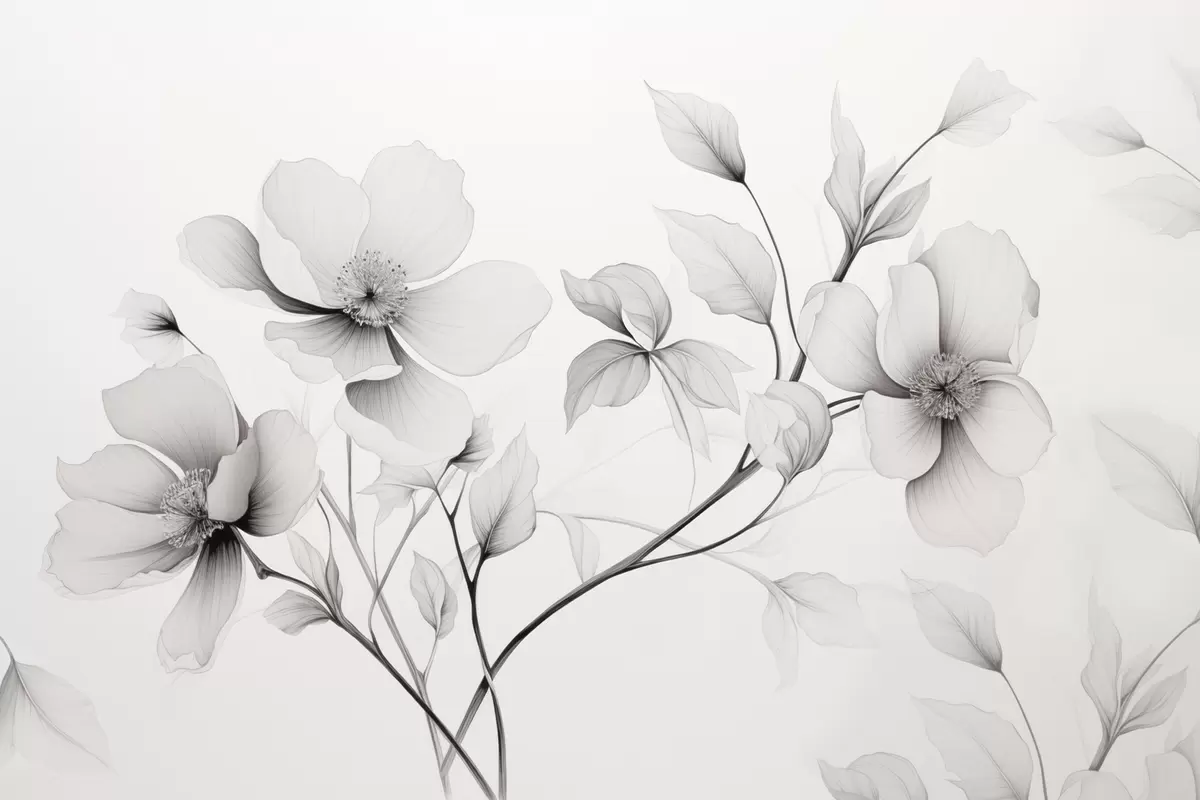 Black and white flowers with elegant lines on a gray background - Wall mural (No. w09271)