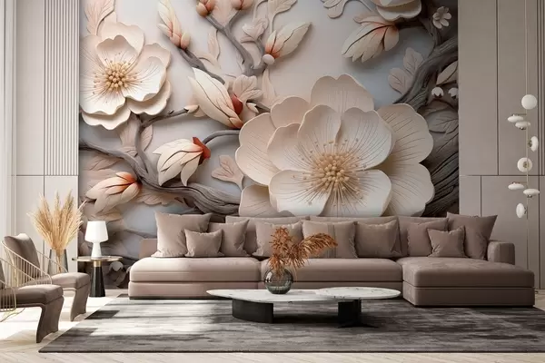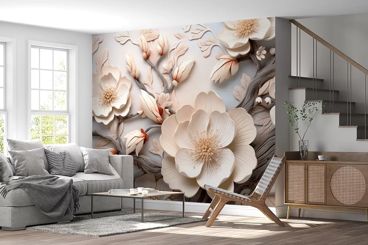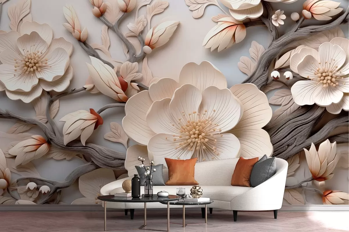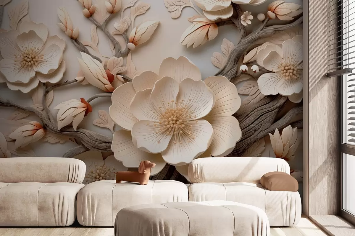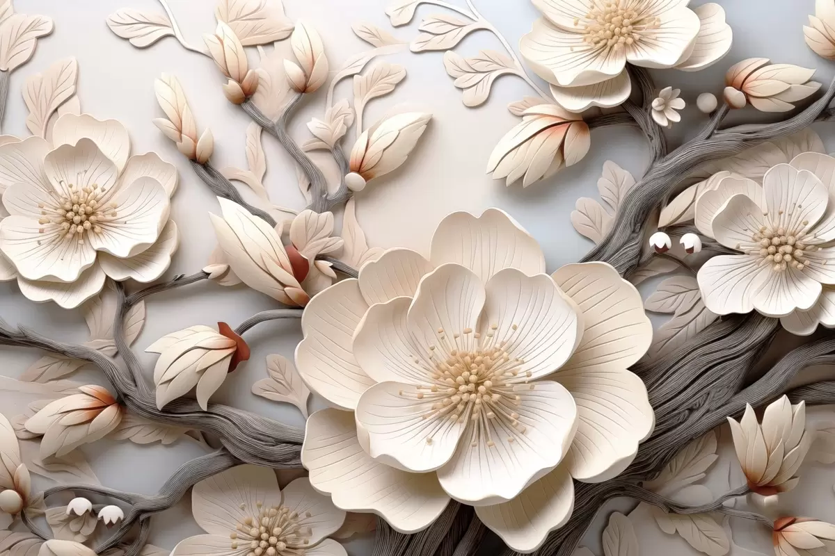 Volumetric flowers and branches in light tones - Wall mural (No. w09272)