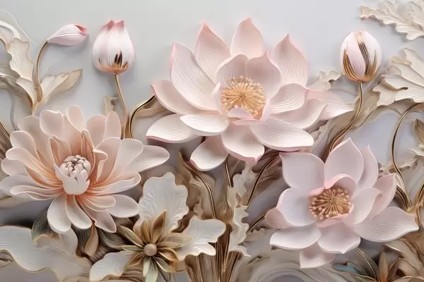 Volumetric pink flowers with yellow leaves - Wall mural (No. w09277)