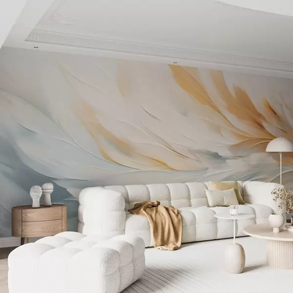 Abstract feathers in soft blue and orange tones - Wall mural (No. w09283)