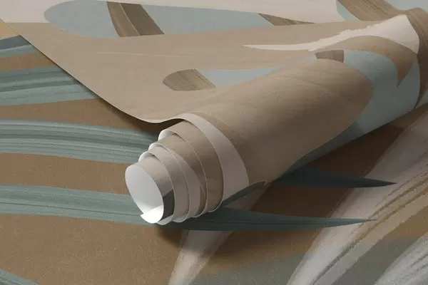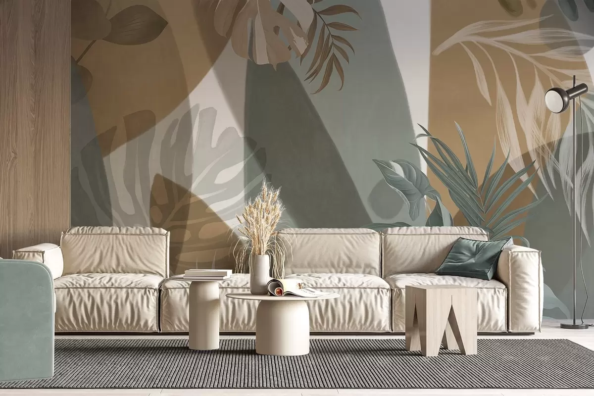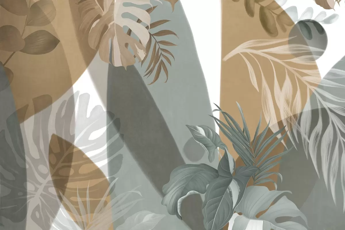 Monstera leaves and palm leaves in a pattern with brown, white and green colors, tropical vibe, abstract shapes, decorative - Wall mural (No. w09288)