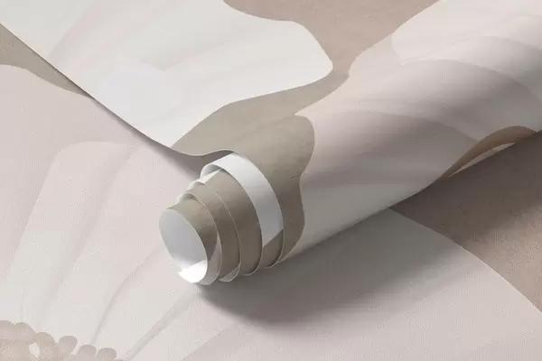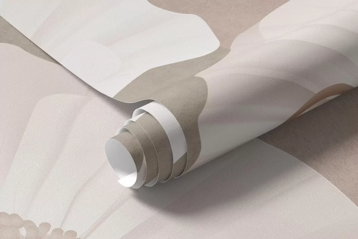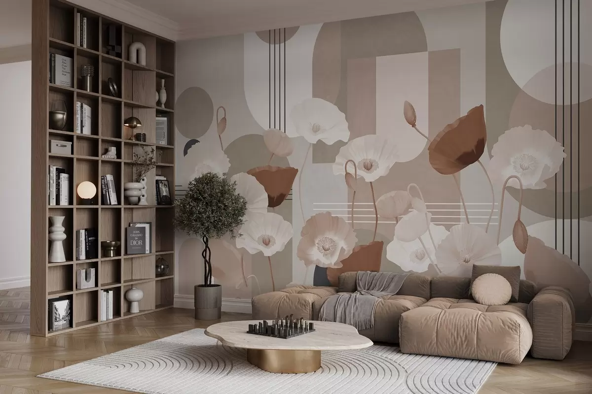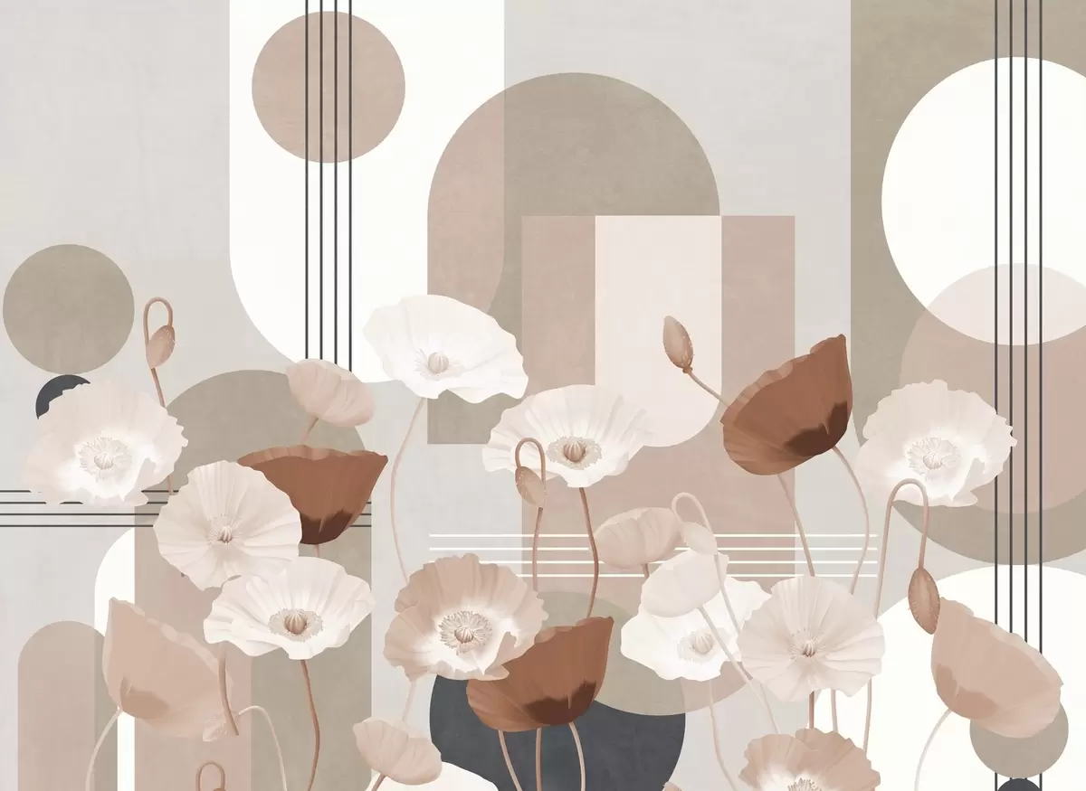 Poppies in white and beige colors with geometric shapes in the background, circles and arches, minimalist style, soft colors - Wall mural (No. w09289)