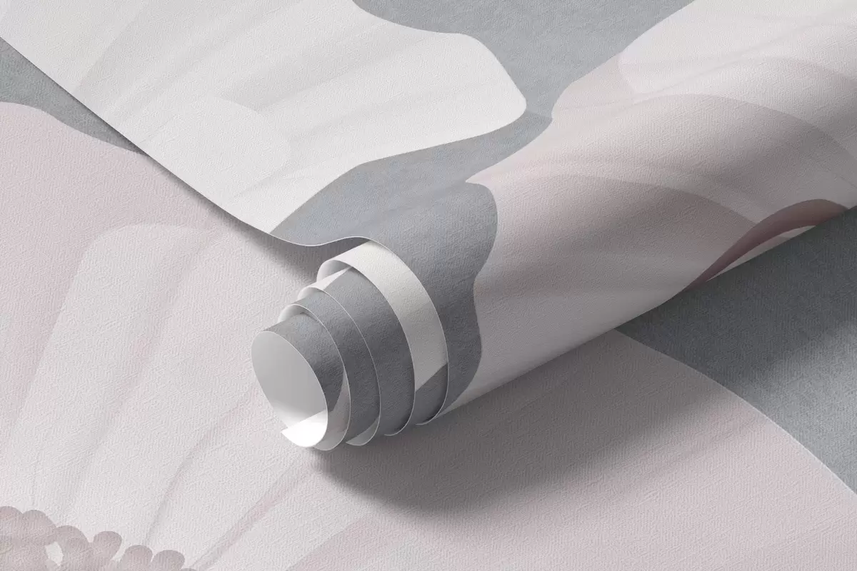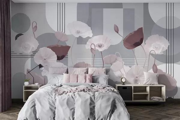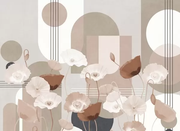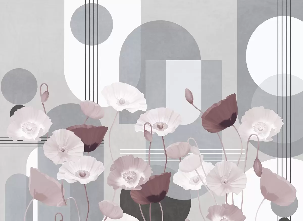 Poppies in white and gray colors with geometric shapes in the background, circles and arches, minimalist style, soft colors - Wall mural (No. w09289v1)