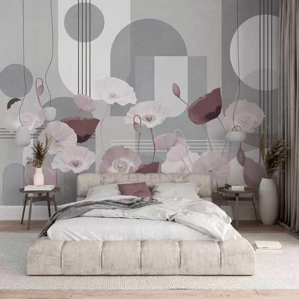 wall murals Poppies in white and gray colors with geometric shapes in the background, circles and arches, minimalist style, soft colors w09289v1
