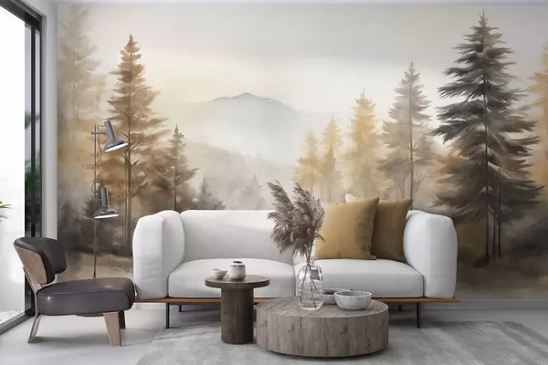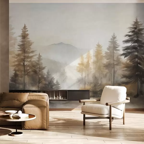 Textured autumn forest with tall pine trees and mountains in the background, the colors are muted and earthy painting style - Wall mural (No. w09290)